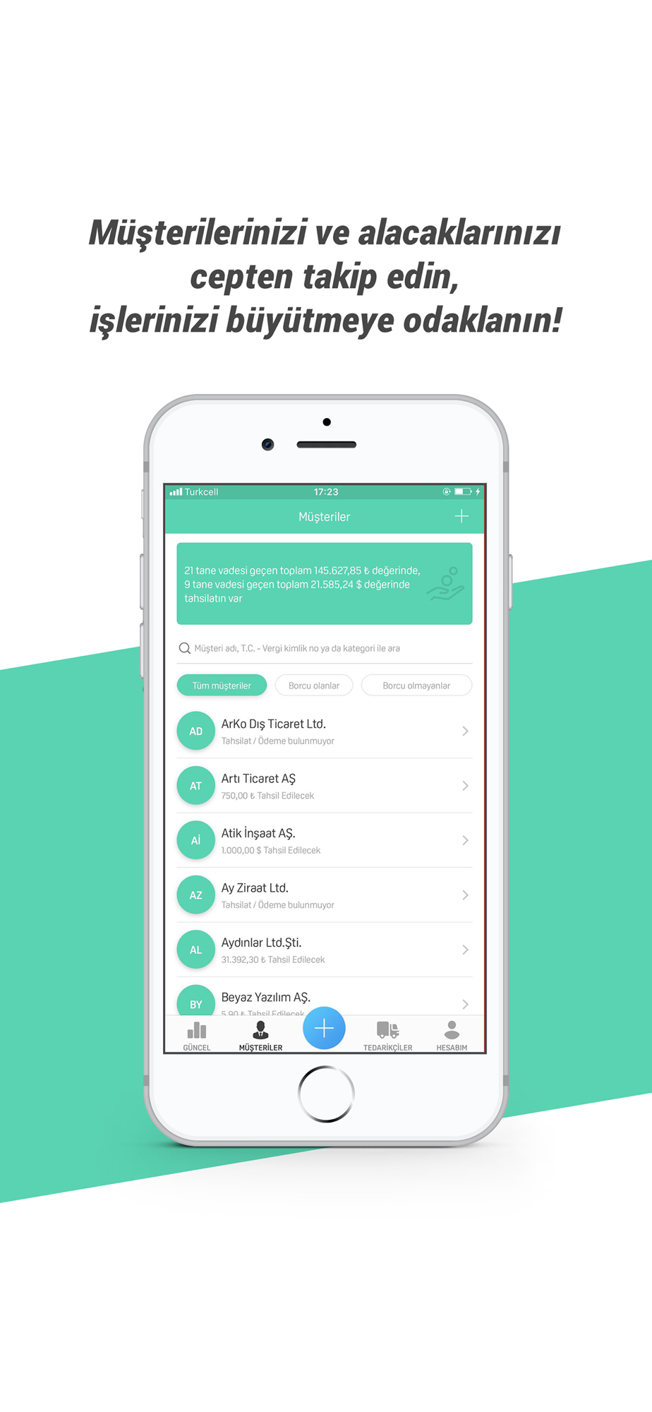 - Müşteri ve tedarikçi oluşturabilir ve düzenleyebilirsiniz. Müşteri ve tedarikçi listelerinize erişebilir, listelerde arama yapabilir ve detaylarını görüntüleyebilirsiniz. Müşteri ve tedarikçilerinize fatura ekleyebilir, telefon ve e-posta yoluyla iletişime geçebilirsiniz. Ayrıca cari kayıt detaylarında işlem geçmişini ve açık faturalarını görüntüleyebilirsiniz.