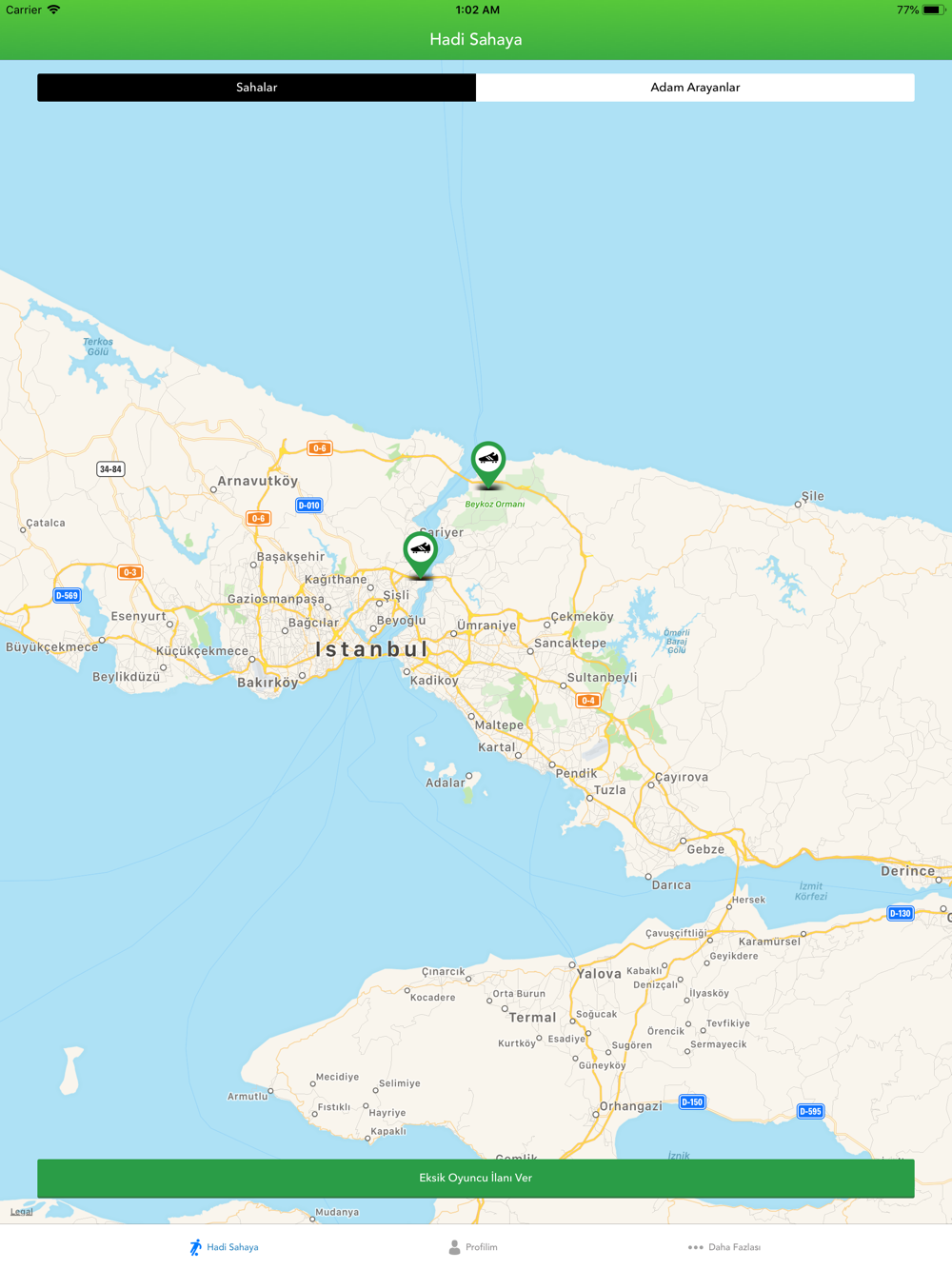 Son dakikada eksik bir oyuncu ihtiyacı mı çıktı? Çevrendeki yeni halı sahaları keşfetmek mi istiyorsun? Harita üzerinde, eksik oyuncu arayan maçları görebilir ya da yeni bir maç düzenlemek için uygun halı sahaları görüntüleyebilirsin!