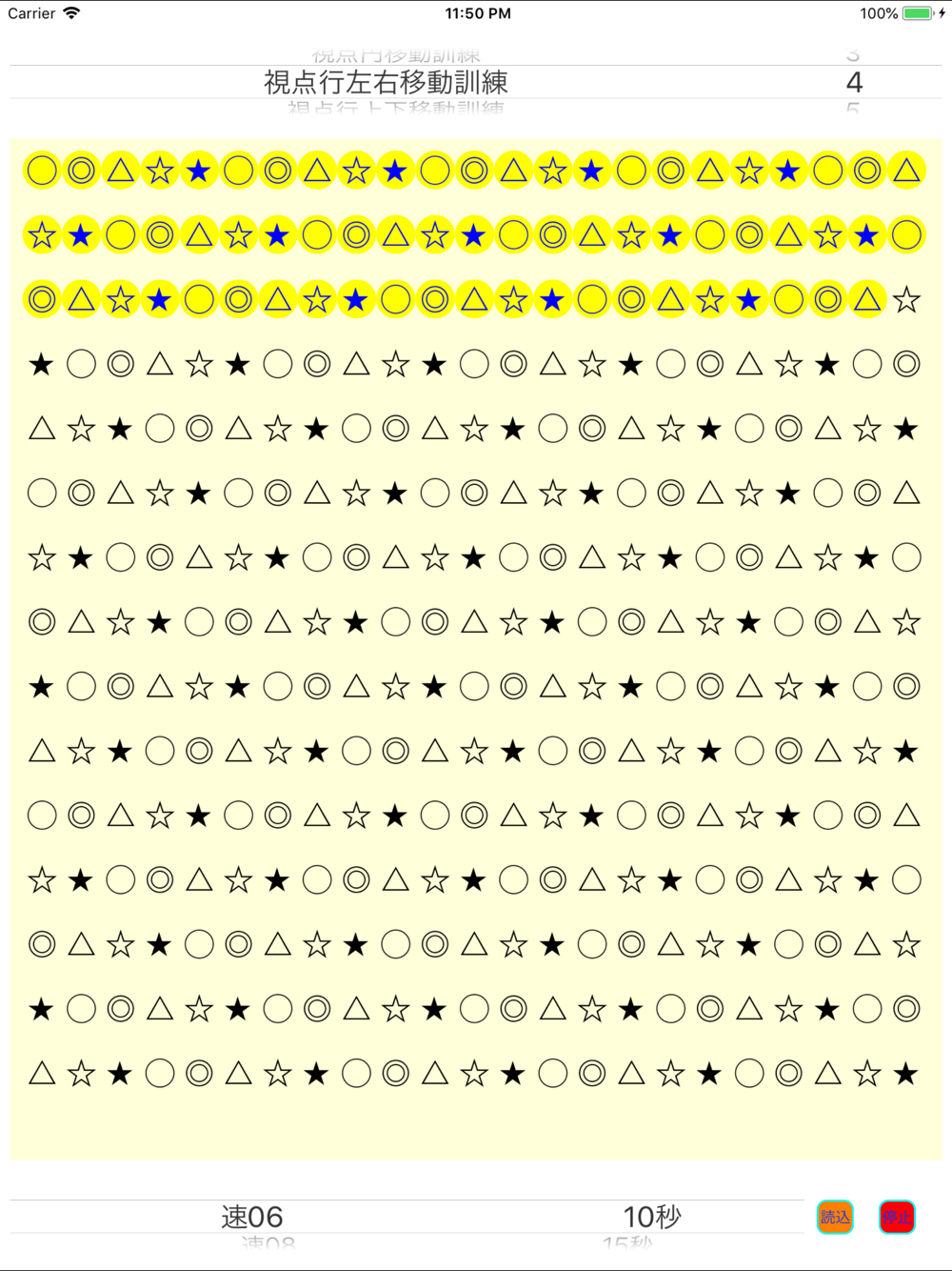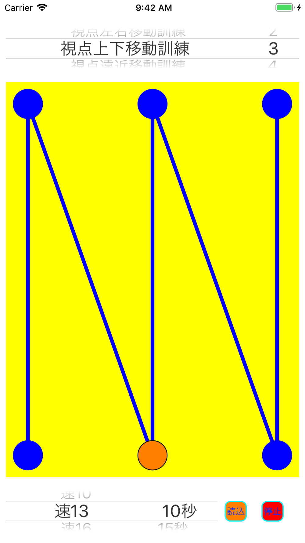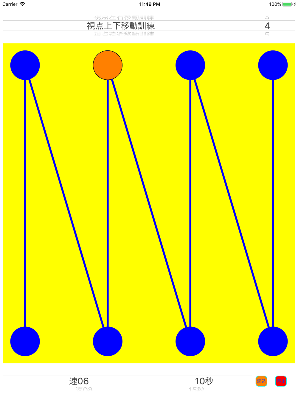 この2つは訓練画面上の青丸の上を移動するオレンジ色の丸を、目で追って行きます。左右に移動するか上下に移動するかの違いがあるだけです。行の数も2〜7まで、上の右のピッカービューの数字で選べます。表示される青の視点の数は行の数の2倍の値になります。ピッカービューを回しずぎると文章選択になりますので注意してください。文章選択の場合はデフォルト値の3になります。移動の速さは下の左の速〇〇となっているピッカービューで選べます。数値が2倍になれば2倍速くなります。速くなりすぎると、実際に眼を動かすのは生理的に不可能になりますので、周辺視野を利用して移動を追うことになります。訓練時間は下の右のピッカービューで選べます。