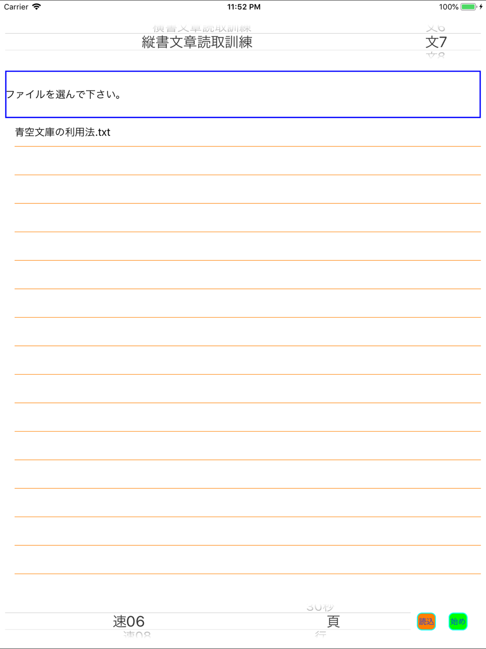 ヴァージョン1.2からドキュメントフォルダー内のテキストファイルを読み込み、表示できるようにしました。「読込」ボタンをタップすればファイル一覧が表示されますのでファイルを選んでください。ファイルは、ShiftJISとして解読を試み、できない場合はUtf-8として再度解読を試みます。解読できた場合は、文9としてセットします。その為、青空文庫のテキストファイル(zipファイルに圧縮されているので解凍処理が必要になります。)を読み込んで訓練に利用することもできます。長い文章は事前処理に時間がかかりますので、見出し単位で読込範囲を決めて読み込めるようにしました。事前処理中は「読込」ボタンの背景が灰色になります。青空文庫の利用方法については、最初に読込ボタンをタップした時(ドキュメントフォルダーが空の時)にドキュメントフォルダーに書き込むようになっています。また、ルビに対応しています。[]でくくられた注釈などはそのまま表示します。はじめのーーーで区分された部分もそのまま表示されます。しかし、追加で外字の注釈を除いて全ての注釈(字下げ、中身出し、傍点など)をカットすこともできるようにしました。