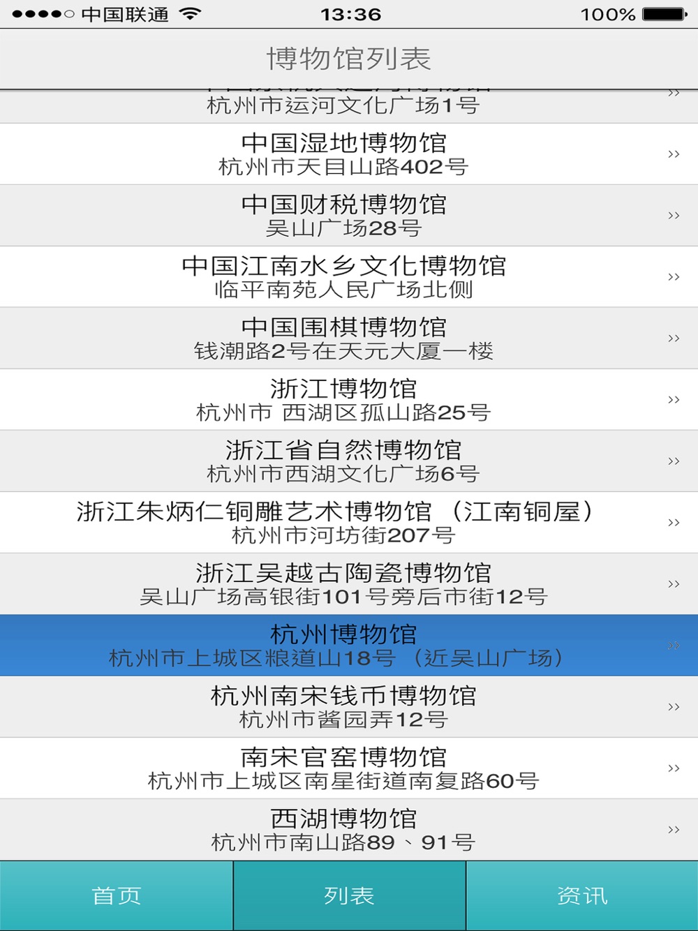 本app,提供杭州范围内的博物馆信息列表,包括地址、联系电话、基本信息、资讯、展览、位置定位等信息。