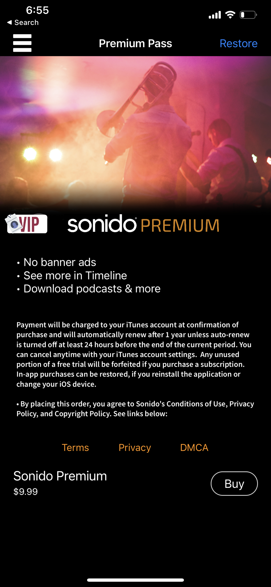 Payment will be charged to your iTunes account at confirmation of purchase and will automatically renew after 1 year unless auto-renew is turned off at least 24 hours before the end of the current period. You can cancel anytime with your iTunes account settings. Any unused portion of a free trial will be forfeited if you purchase a subscription. In-app purchases can be restored, if you reinstall the application or change your iOS device. See Terms (https://www.sonido.fm/terms) and Privacy Policy (https://www.sonido.fm/privacy).