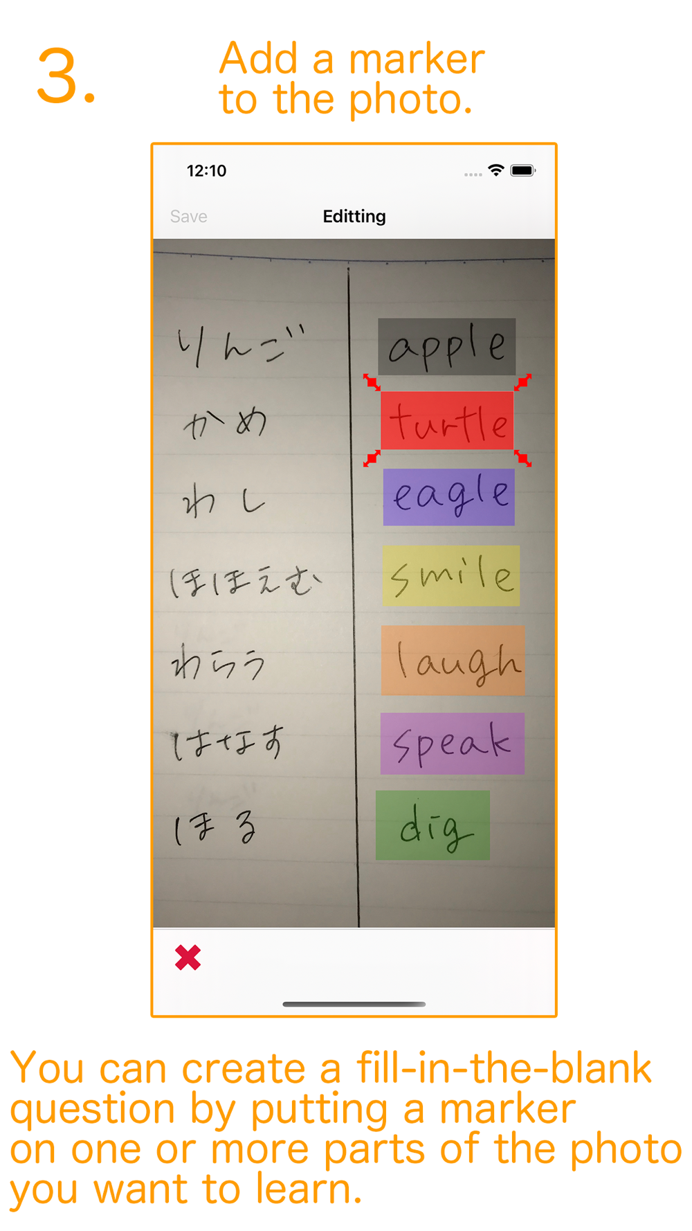 After importing the photo in the app, you can create a fill-in-the-blank question by marking some or more parts of the photo you want to learn.