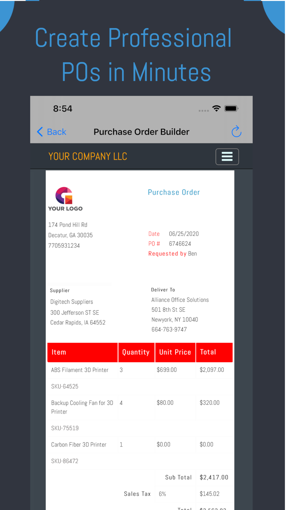 Purchase Order Builder is a powerful app that lets you create professional Purchase Orders, Estimates, Invoices & Receipts in minutes. Easily Prepare digital Purchase Orders and email them directly to your suppliers in PDF format. Easily Order and Receive your POs in One Platform