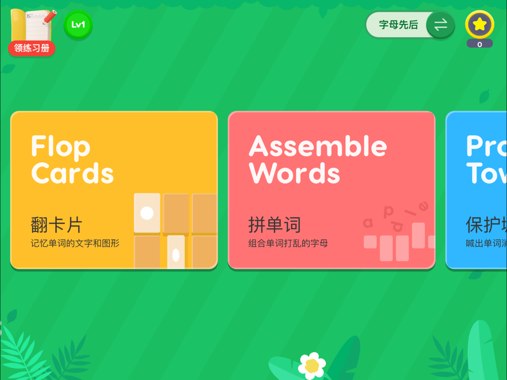此APP为L1单词强化练习,为0基础的孩子选取了104个单词供游戏中学习记忆。