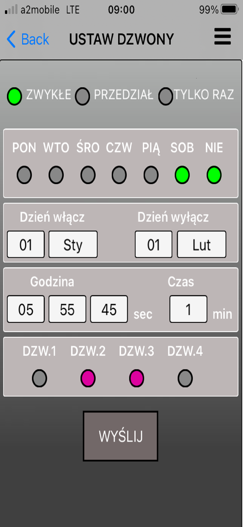 Aplikacja do zdalnego zarządzania sterownikiem dzwonów i zegara na wieży kościelnej. Oprócz wszystkich funkcji dostępnych z menu sterownika dodatkowo umożliwia wykonanie kopii bazy i zapisanie jej w telefonie oraz późniejsze odtworzenie bazy w sterowniku z zapisanych kopii.