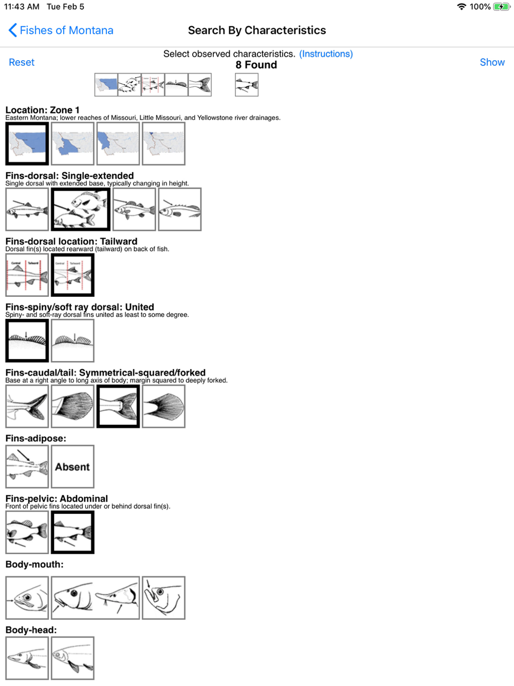 FISHES OF MONTANA is a collaborative effort between Montana State University's Department of Ecology, Montana Fish Wildlife & Parks, and MountainWorks Software. FISHES OF MONTANA provides an easy-to-use visual reference and interactive keys to the 90 species known to be found in the waters of Montana, and 10 Aquatic Invasive Species that we wish to keep out of Montana. A user can identify a fish visually by browsing through images of fish, search by name and family, or by using identifying characteristics such as fin structure, location of mouth, or geographical location. Each species is profiled to include images of the fish, range maps for both Montana and the U.S., preferred habitat, adult size, appearance, life history, similar species, and more!