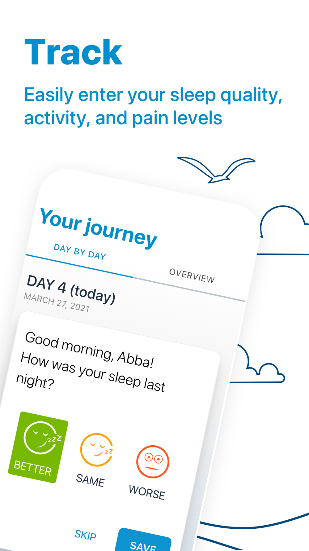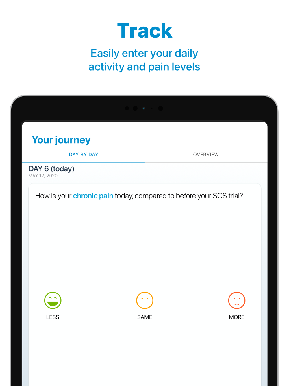 • Track: During your SCS trial, you can share with your physician how your pain and activity levels are changing and/or improving by recording them daily. This app will allow you to quickly and easily enter information to help you and your care team better understand your journey.