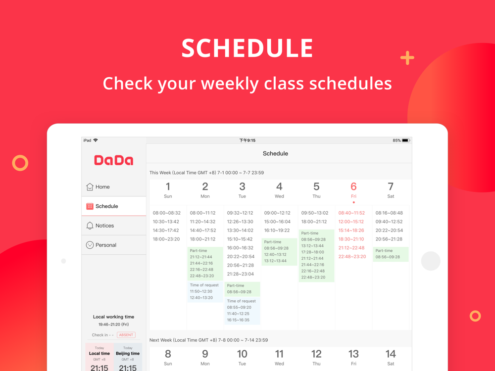 1. Check out your weekly schedules, including both fixed and part-time slots.