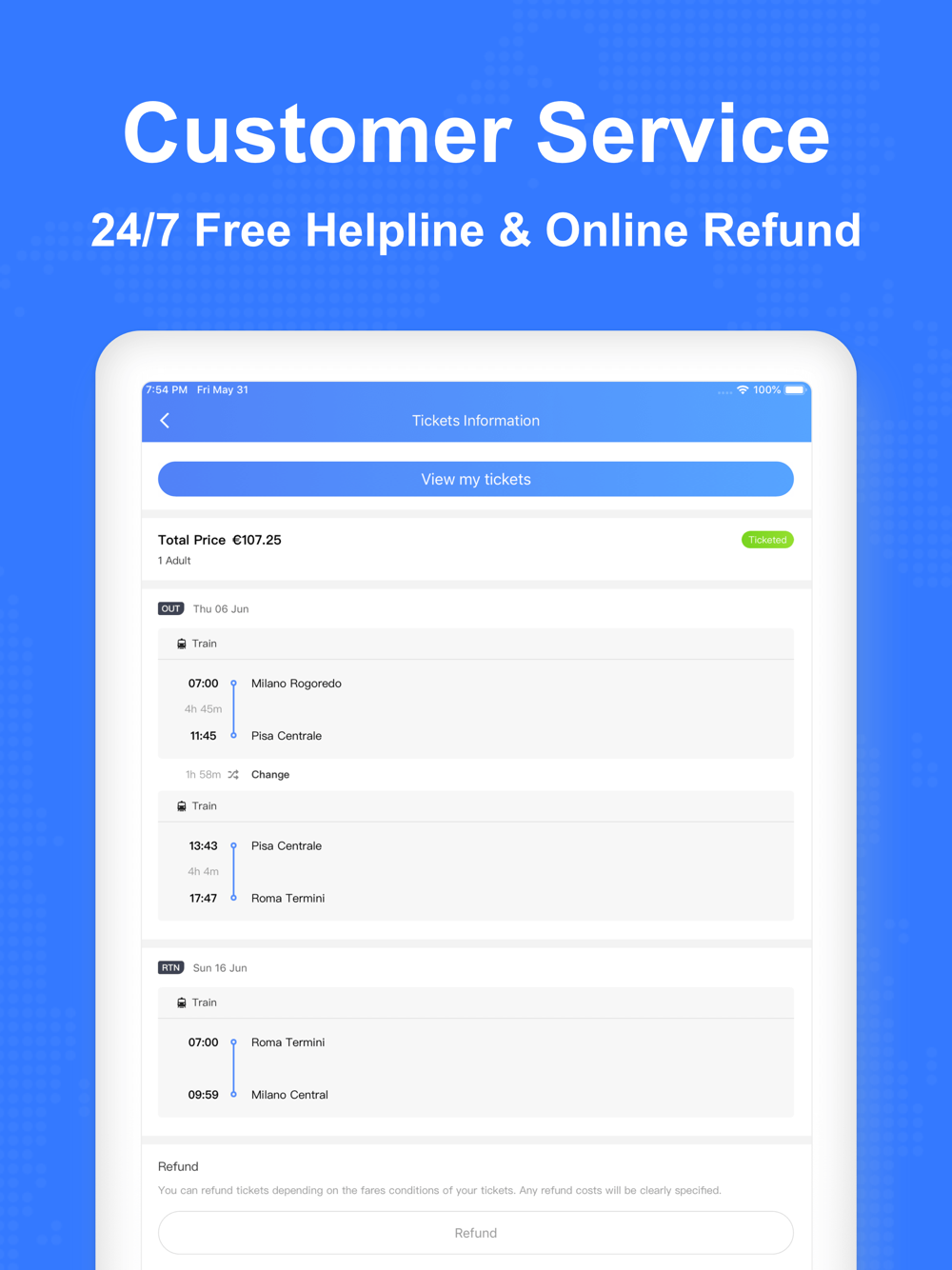 Smarter customer service: Refunding and changing tickets is easy on the TrainPal app. A refund for flexible tickets can be simply submitted and changed for Advance tickets in your TrainPal app, without having to contact customer service.