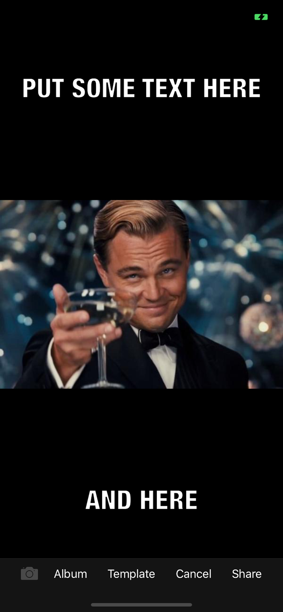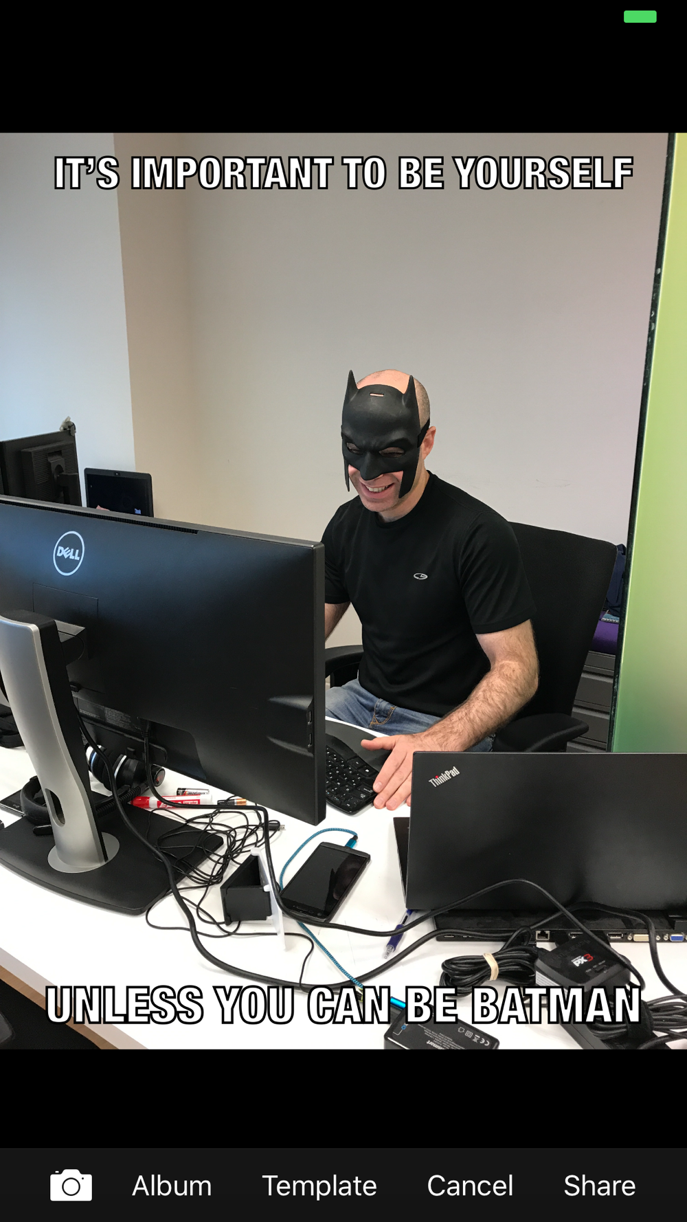 Easily create your own custom memes in 1 click. Just take a picture with your camera or use the one from your gallery, add some text and share! Various popular templates are also available and regularly updated.