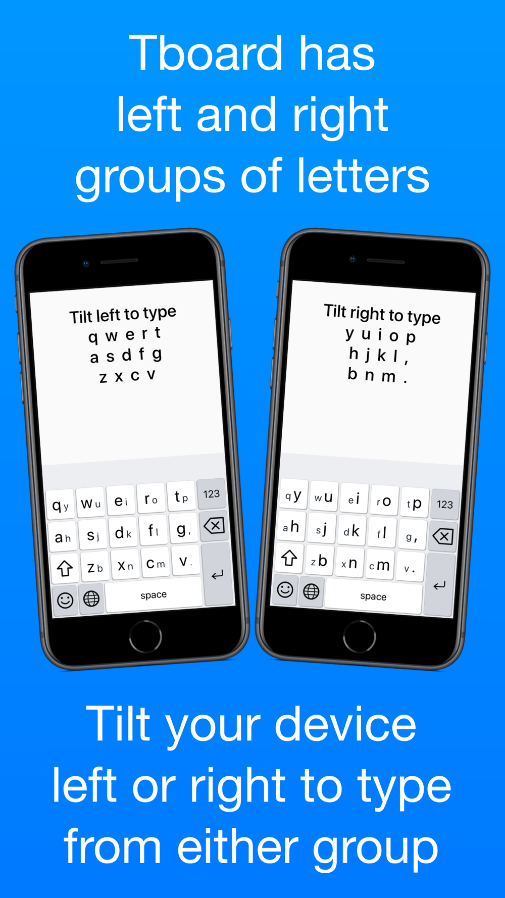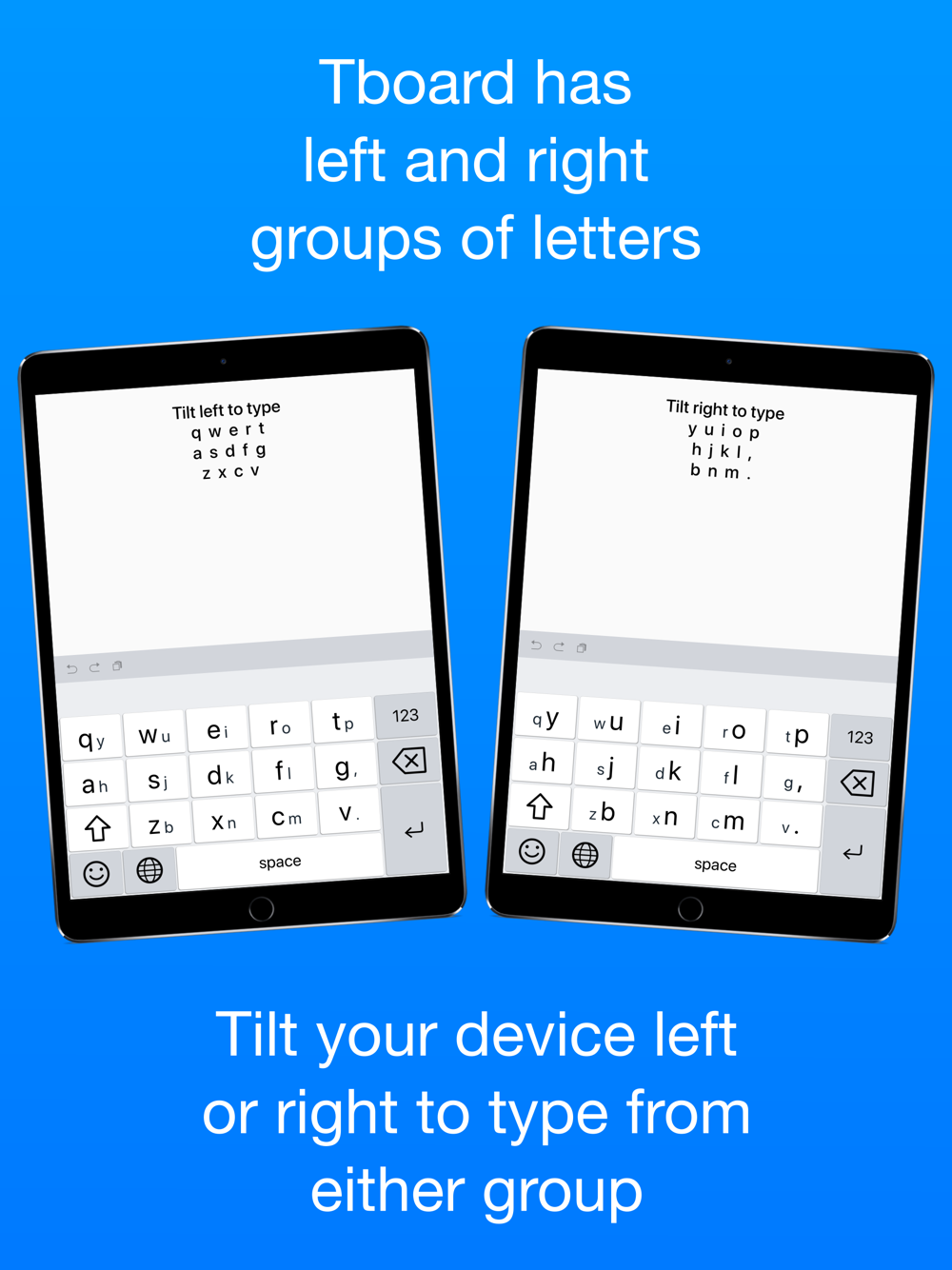 To type a letter from either group, simply tilt your device left or right. When a slight left or right tilt occurs, Tboard automatically changes the letter group you can use. Once the tilt is made, just select the letter you want to type like in any other keyboard.