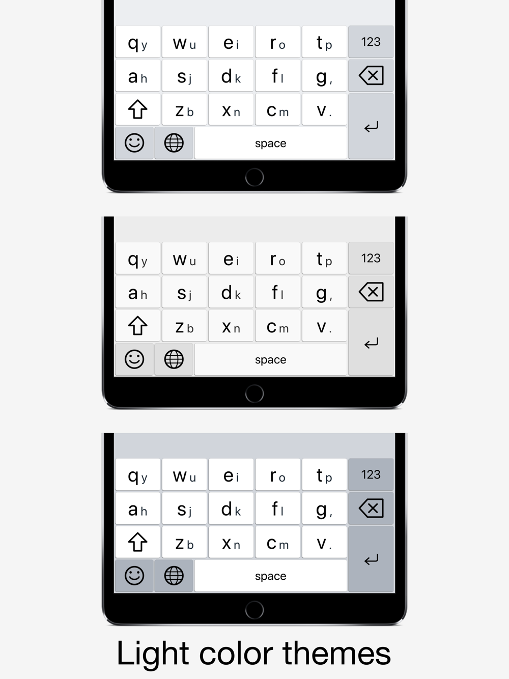 - Different keyboard layouts: arrange the letters alphabetically, or according to the QWERTY, AZERTY, QWERTZ, or QZERTY layouts