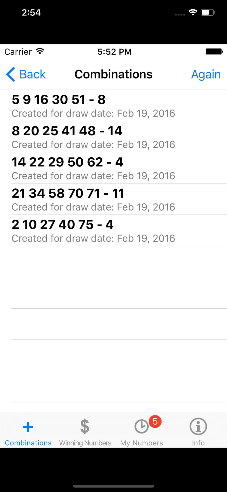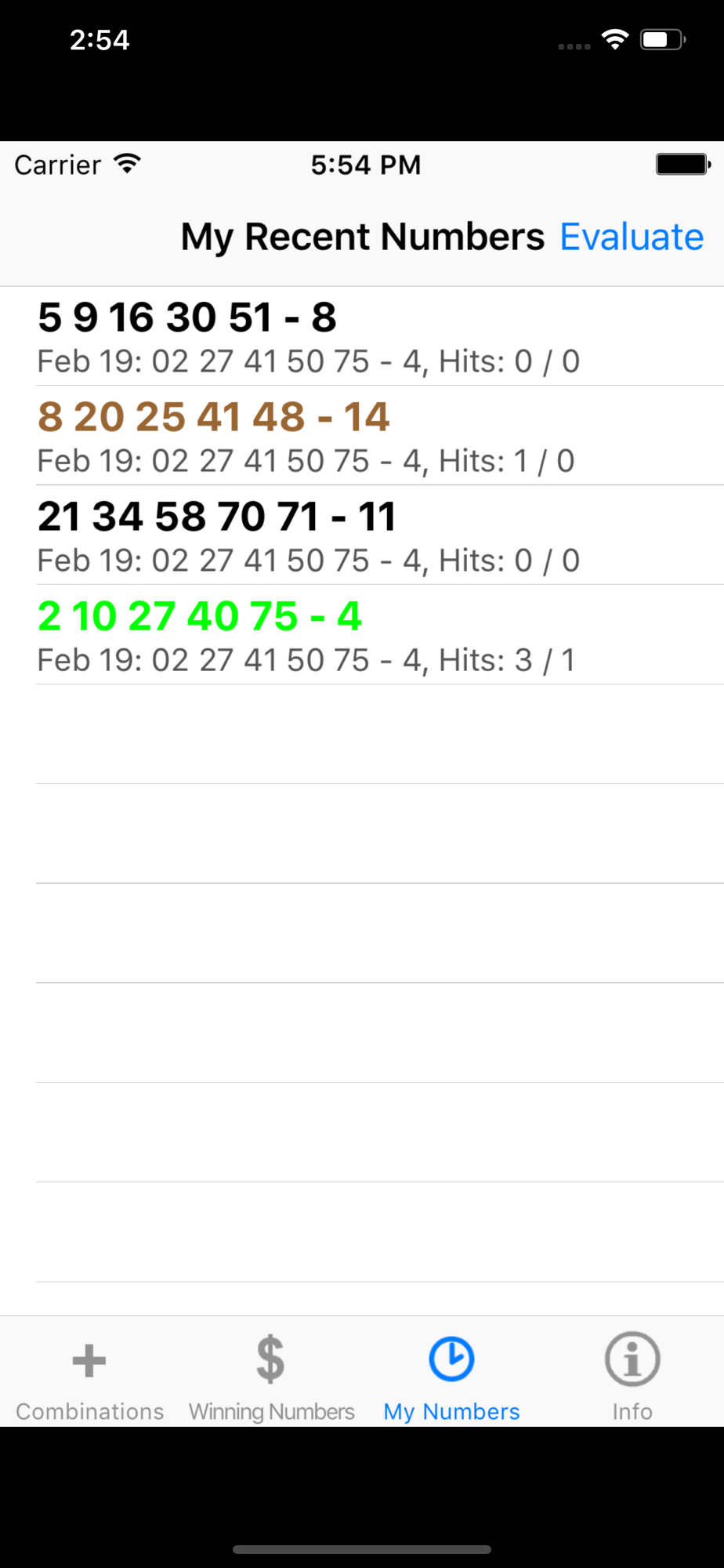 When you evaluate your numbers against the winning numbers, the app displays number of hits for each of your combinations and color-codes all your combinations as follows: