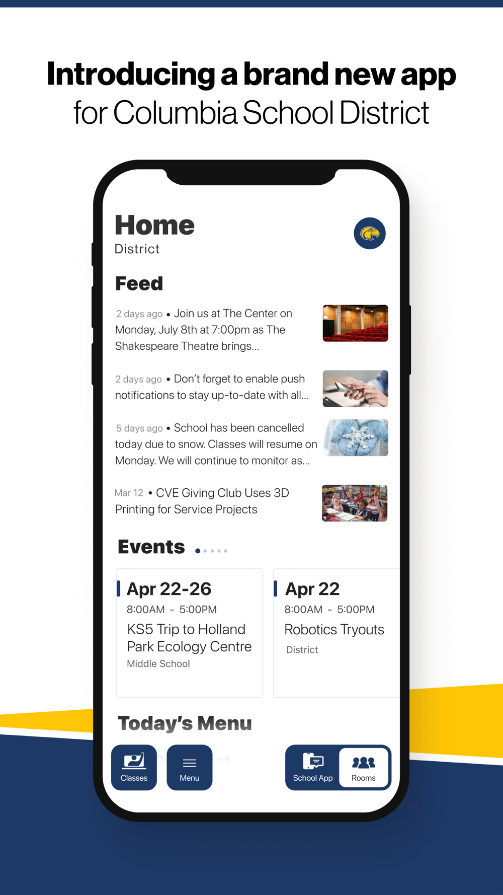 The event section shows a list of events throughout the district. Users can add an event to their calendar to share the event with friends and family with one tap.