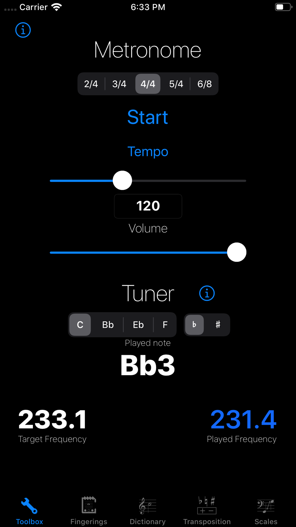 The Tuner displays the frequency and note you are trying to play along with your instruments frequency. Simply adjust your instrument so the two frequencies are close (+ or - 4 or less)