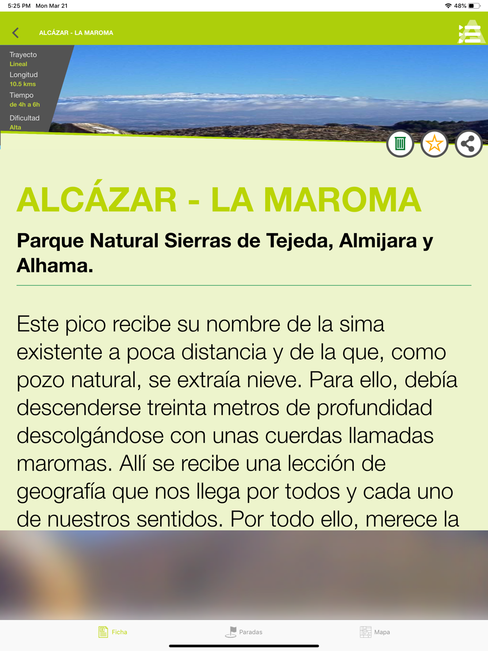 La versión actual de esta aplicación incluye textos e imágenes organizadas en paradas que facilitan la exploración del patrimonio rural. Además, incluye funciones tales como el filtrado de senderos en función de determinados criterios, la configuración de la información a incluir en la visualización de mapas o la descarga, actualización y borrado de itinerarios.