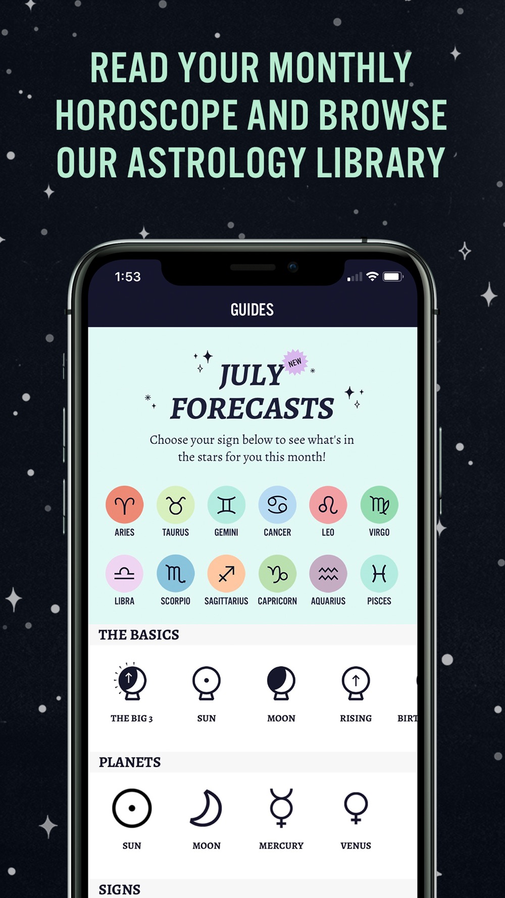 “...the only astrology app that provides the option of engaging in a live consultation with an actual astrologer (not an algorithm or a bot) any time, night or day, every single day of the year” — New York Magazine