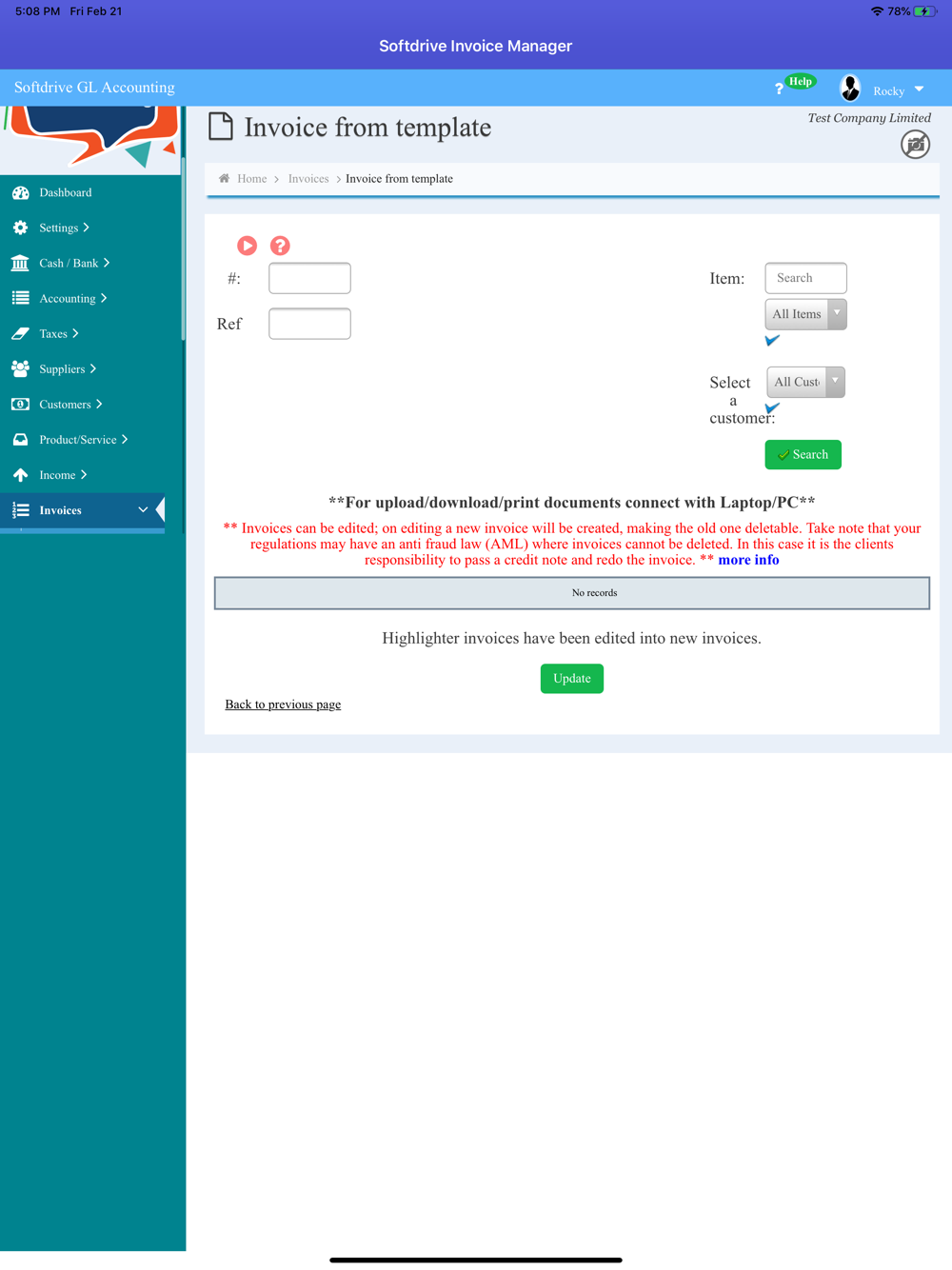 To use Softdrive Invoice Manager you must be a registered user on softdrive.company - create you softdrive account & manage your invoicing from your mobile. Create Invoices, Quotes, Email instantly to client, follow-up & record payments, with many more features cloud based for the multi access, multi-currency, multi languages & confirms with your local tax regulation. Edit reports & forward to your external accountant