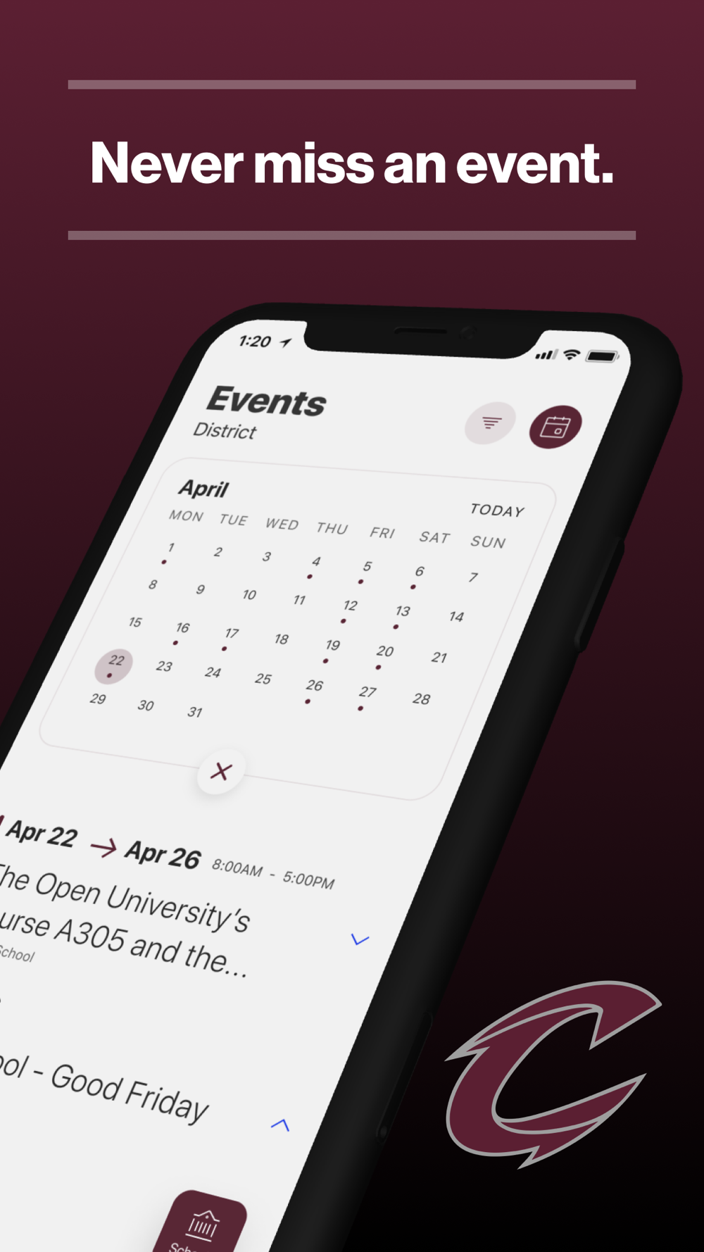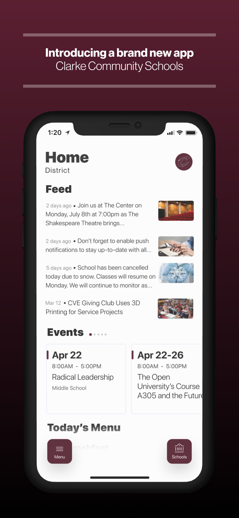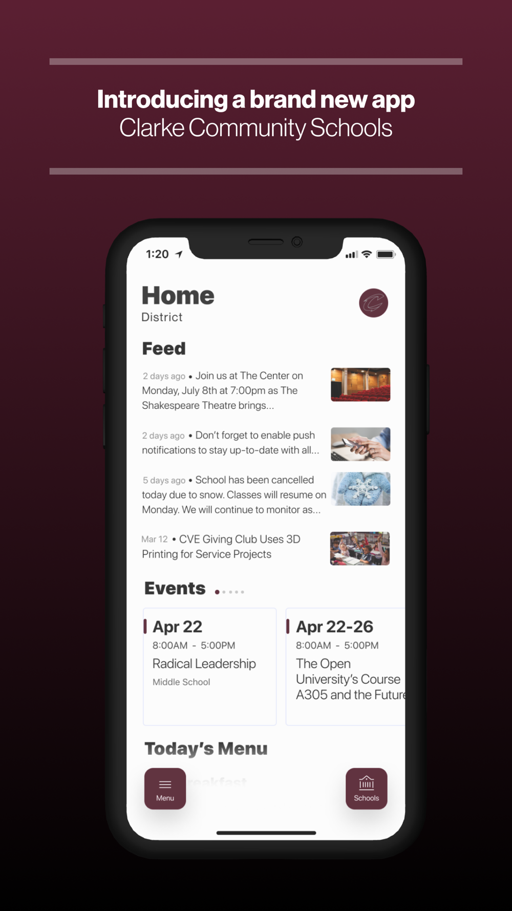 The official app for Clarke Community Schools, Iowa allows users direct access to the most recent news, announcements and event calendars. Customize the app to display information relevant to a specific campus and to receive important notifications from the district. Users may also access the directory of district faculty and staff, view dining menus, find the location of district events, contact campuses and departments, follow athletic scores and updates, and much more.