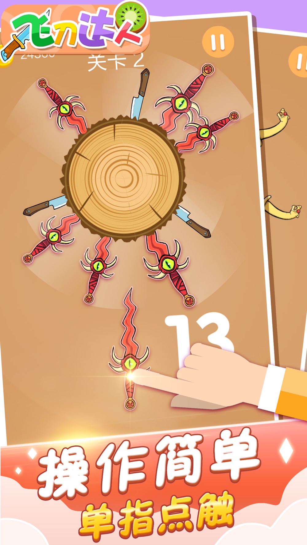 风靡全球的趣味小游戏来了——飞刀达人!有趣的单机游戏,单指就能操作,向屏幕中间旋转的木头上扔飞刀,见缝插针,还可以挑战挂在木头上的小水果,切掉水果还有金币奖励哦!更有超多飞刀样式等你解锁!考验眼力和手速的时候到了,就是现在,赶快下载游戏来玩吧!