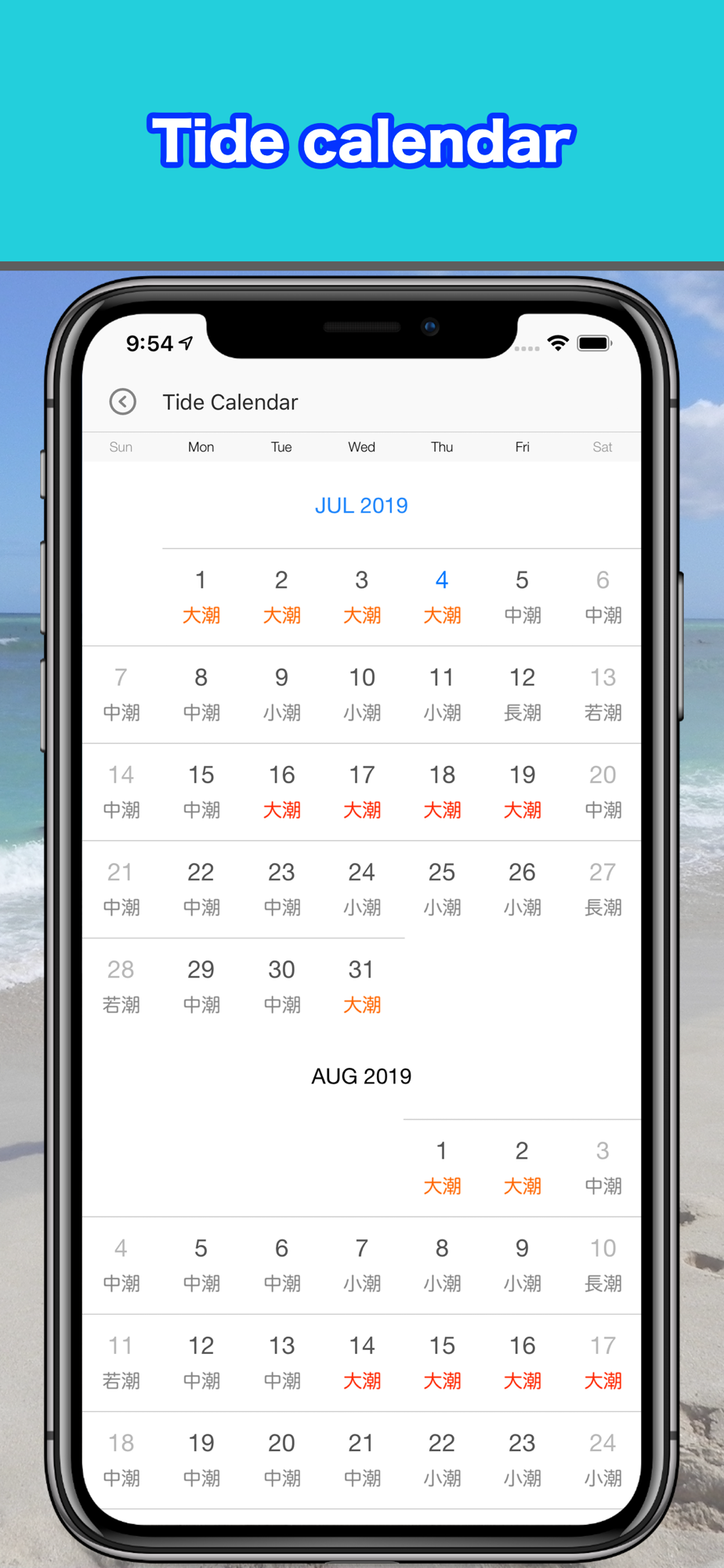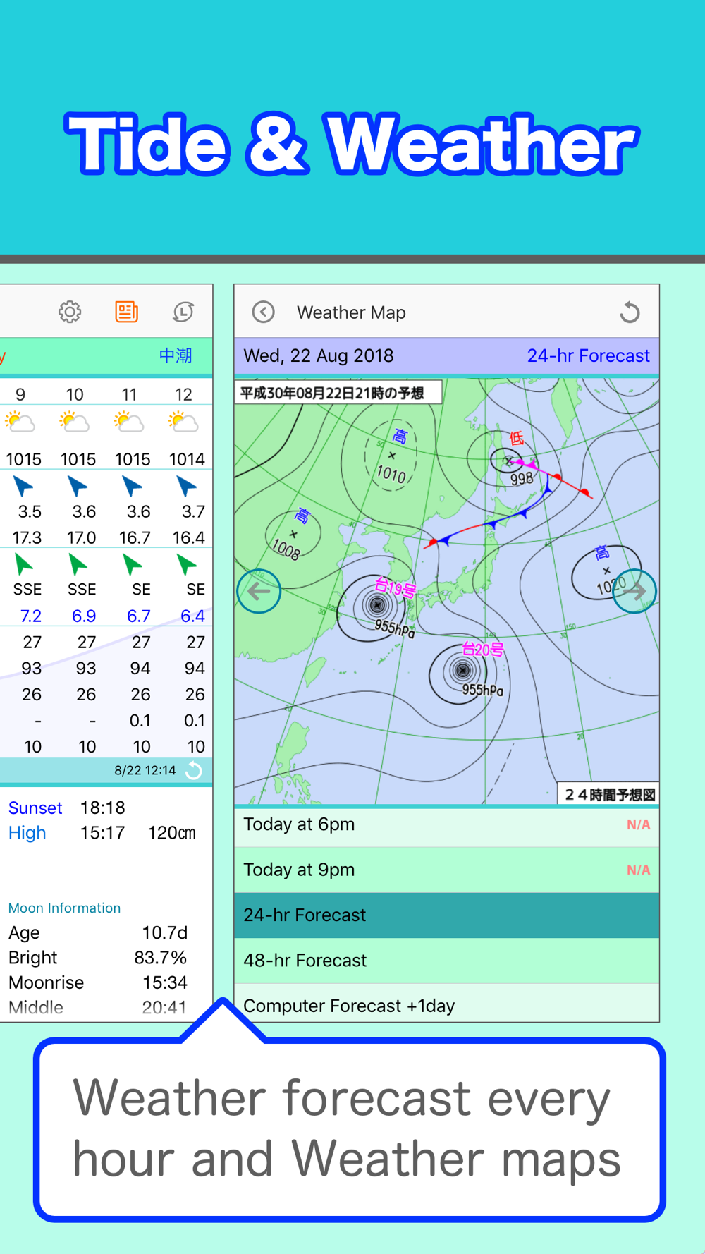 The app show a flashing mark on the tide graph current time. so you can check easily the tide moving. Also you can check a sunrise and a sunset from graph.