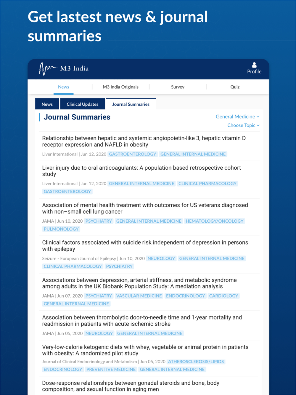 Short summaries from most important Journals and Clinical news by specialty, Expert articles, General news and happenings related to Indian Doctors