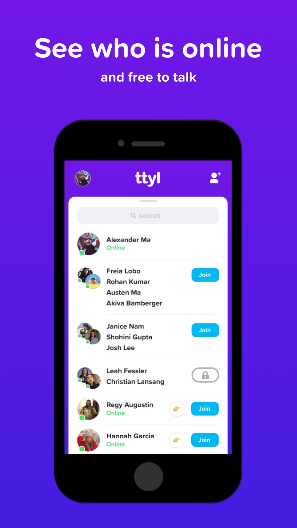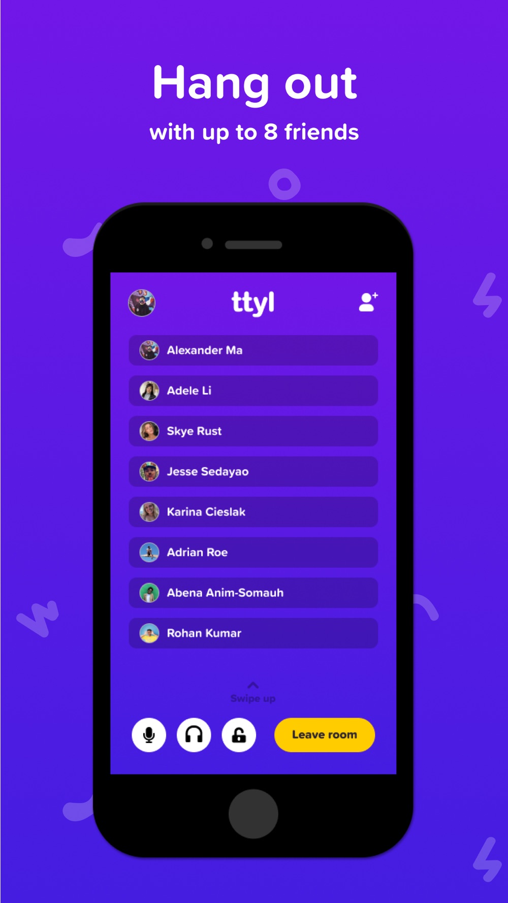 TTYL is the audio social network, where hanging out with your closest friends is as easy as throwing on headphones. See who's free to talk and jump into conversations with up to 7 of your best friends. If you're the first one online, just background the app and let them jump in your ears!