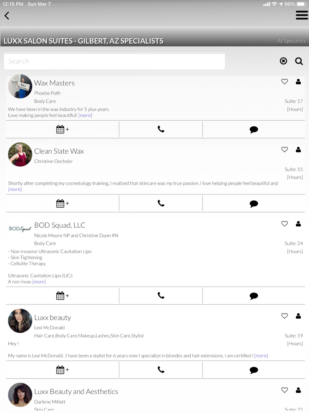 The Luxx Salon Suites mobile app is for clients of tenant businesses to book appointments, communicate, confirm and pay for hair, nail, and massage services provided by the business owners that reside in a location.