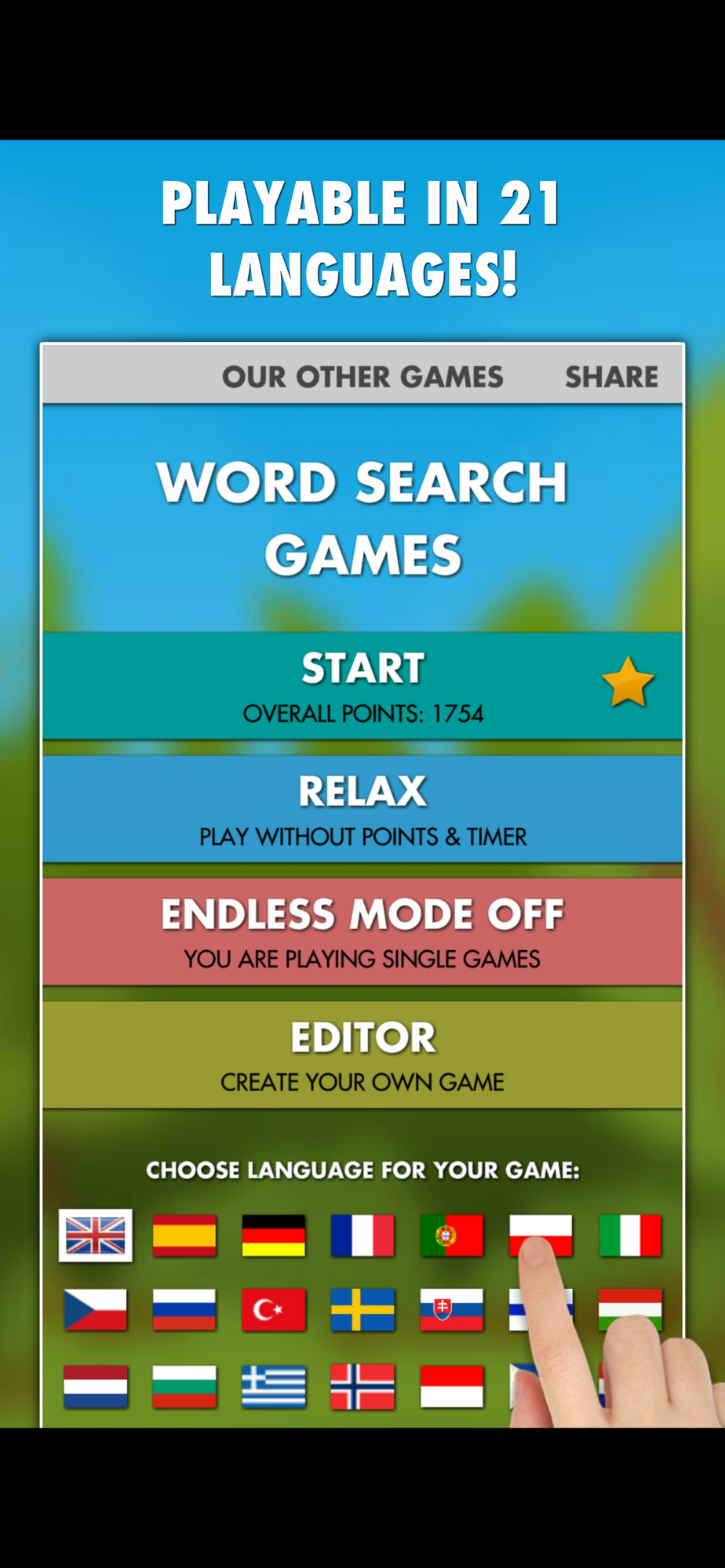 Will you find all the hidden words in our relaxing Word Search Games? Our word search games are playable in 21 languages! Challenge other people from all around the world and try to make it into TOP20 or play in a relax mode without a timer!