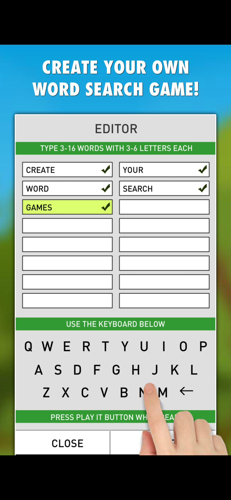 Create your own word search game in the Editor! Just type 3-16 words with 3-6 letters each and have fun with your own words - you can play each game created more times, so let your friends or family play it to see who will find your words with the best score!