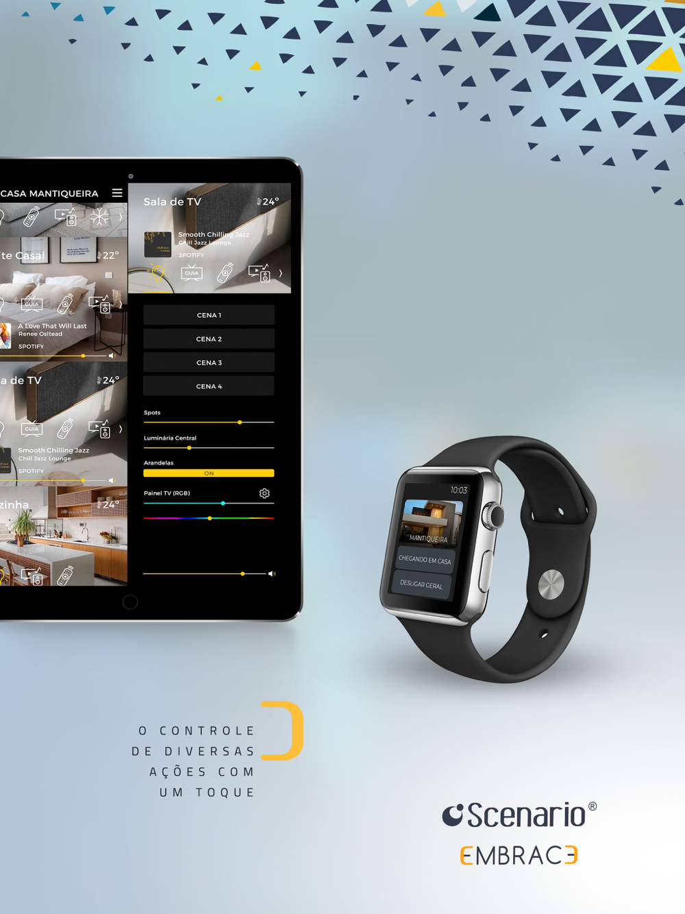 Este aplicativo traz as funcionalidades da linha Scenario/Embrace para seu iPhone, iPod touch e iPad. Com ele é possível controlar local ou remotamente apenas os produtos da linha Scenario/Embrace. Para isso, é necessário que o usuário possua equipamentos Scenario/Embrace instalados e configurados. Para a linha Scenario/Classic, deve-se utilizar o aplicativo Scenario Touch. As funcionalidades atendidas são: controle de iluminação, cortinas, ar condicionado, sistemas de irrigação, equipamentos de audio e video local ou multi-room, guias de TV para as operadoras brasileiras, controles globais da residência e de atividades. O aplicativo permite também a configuração de diversos elementos do sistema Scenario/Embrace como: cenas de iluminação, horários de agendamento de tarefas e parâmetros das rotinas CATTM (Context Awareness Technology), exclusivos da linha EMBRACE. Esse aplicativo foi criado para executar tanto as telas da interface gerada automaticamente pelo sistema Embrace, como também as customizadas pelas revendas autorizadas da Scenario. Nas telas geradas automaticamente o usuário do aplicativo pode personalizar, inserindo fotos de sua residência e/ou ambientes ou modificando a sequência das telas.