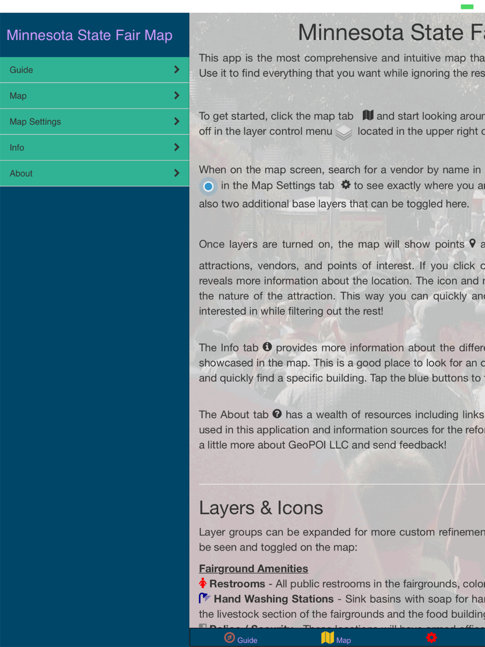 This is your ticket to navigating the chaos of the Minnesota State Fair with ease! It allows users to see the locations and details of over 1000 food and merchandise vendors in an intuitive map that can seamlessly zoom and track your position with GPS. All attractions are displayed on the map by default so that you can always find what is nearby.