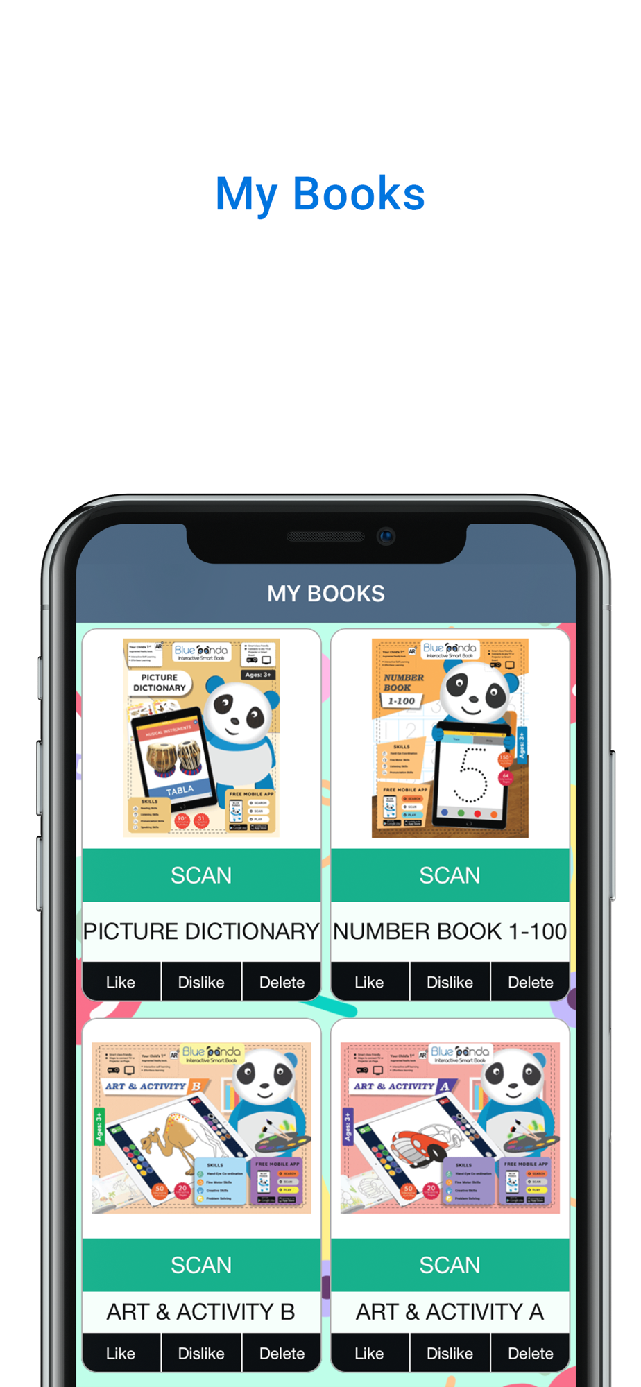 Just scan the picture/pages in Books with Blue Panda logo, and watch the pictures/pages come alive on your phone or tab.