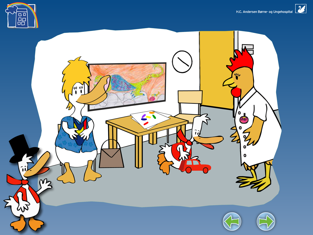 Børn i denne aldersgruppe lærer og erkender ved leg og konkret information. Indlagte og ambulante børn kan hurtigt blive “fyldt op” med en masse information. Derfor er HC And bygget op af korte sekvenser i børnehøjde, så “nye” kan starte her.
