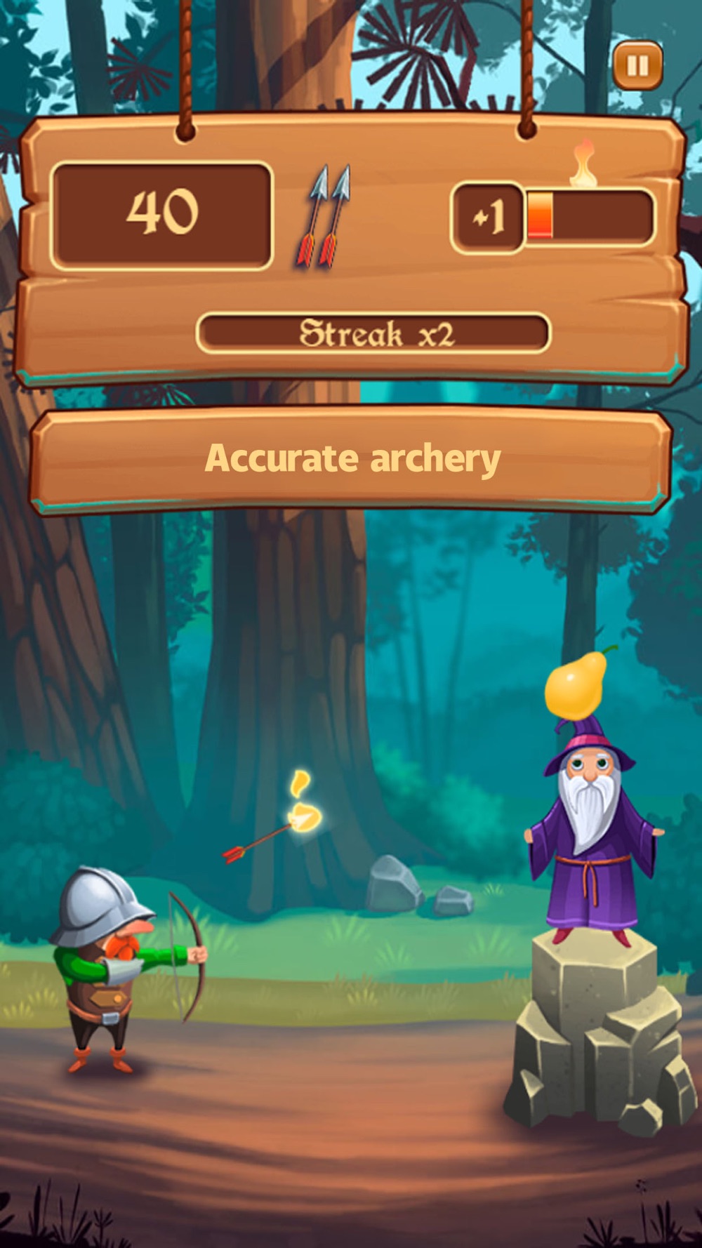 Try to shoot the fruits off of the boys heads,just do not let any of them get hurt.