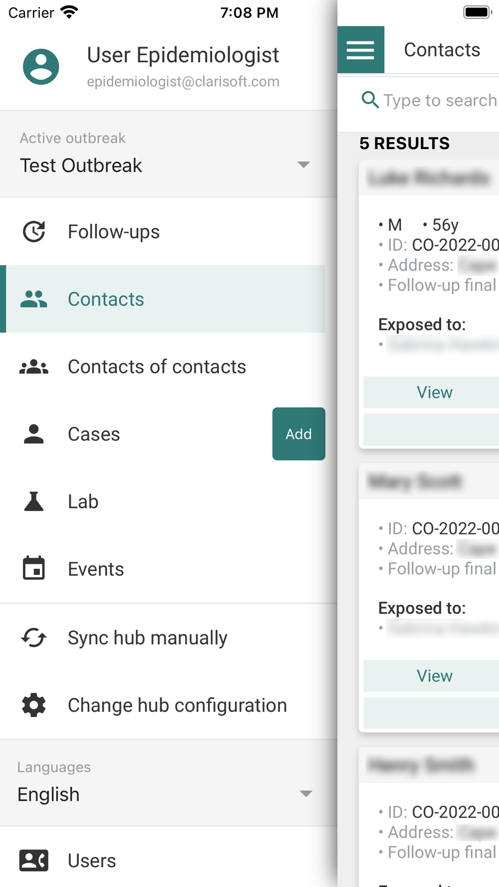 User can add cases, contacts, contacts of contacts and laboratory results. In addition users also have an option to create events which may be relevant for outbreak investigation. Contact follow-up lists are generated using outbreak parameters (i.e. number of days to follow-up contacts, how many times per day should contacts be followed-up, follow-up interval).