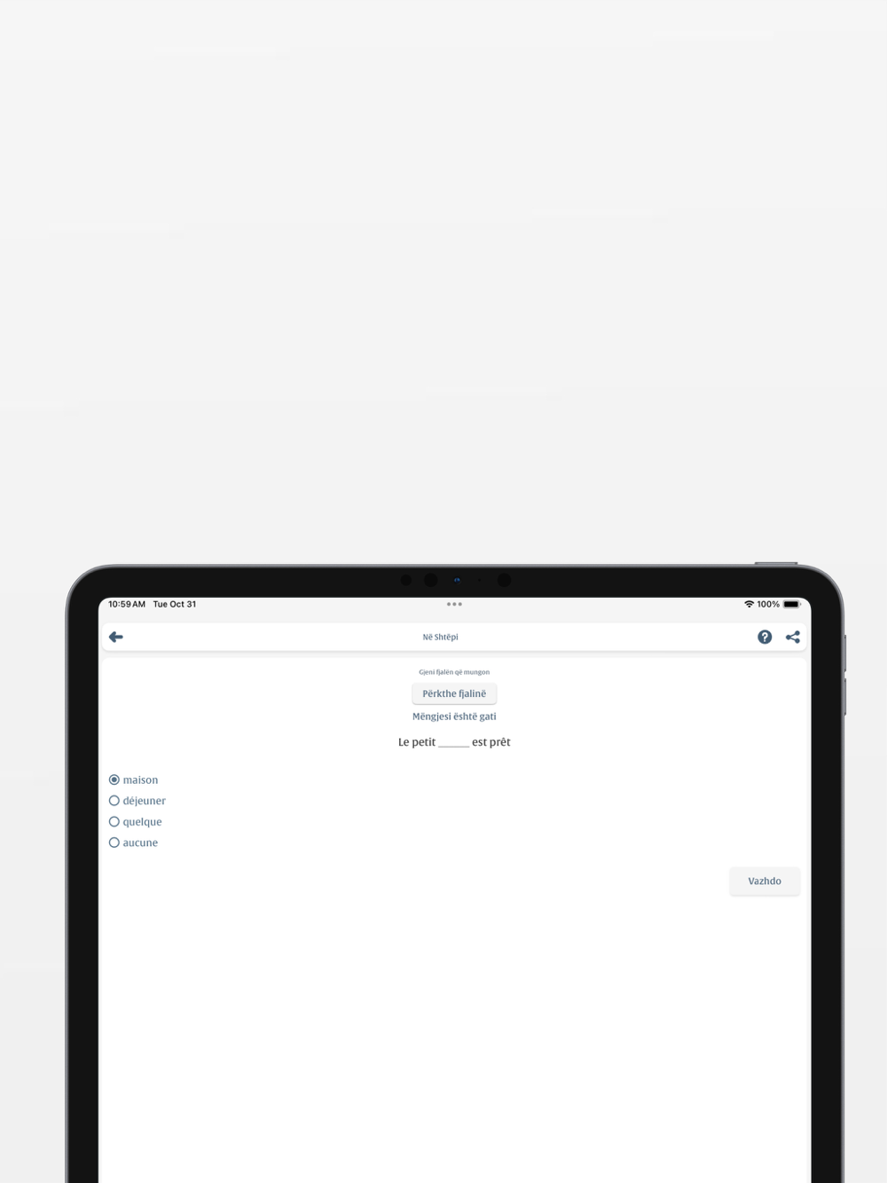 - Aplikacioni ynë i frengjishtit është krijuar posaçërisht për shqiptarët që dëshirojnë të marrin një kurs frengjisht të përshtatshëm për të gjitha nivelet. - Për ata që janë në nivelin fillestar, ofrojmë mësime që ju ndihmojnë të flisni frengjisht që nga ditët e para. Për më tepër, audio mësimet tona janë ideale për të përmirësuar aftësitë tuaja të dëgjimit dhe të flasjes në gjuhën frenge. Dhe nëse keni nevojë për një ndihmë ekstra me fjalët apo strukturat, fjalori ynë frengjisht-shqip dhe seksioni i gramatikës së frengjishtit janë gjithmonë në dispozicionin tuaj.