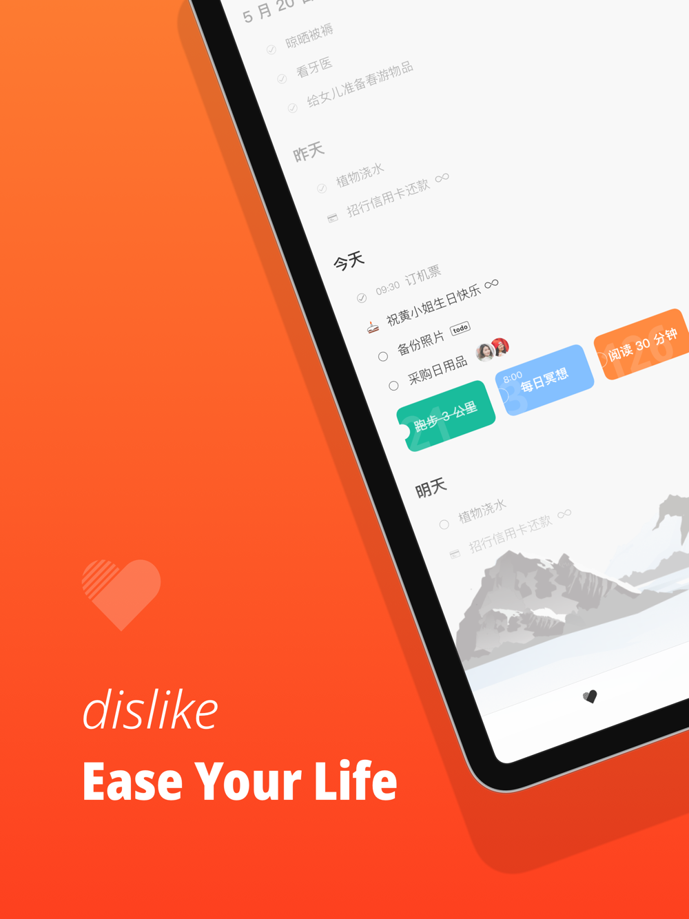Unlike most to-do or calendar apps, Dislike focuses on life issues rather than work efficiency. What Dislike cares is to help you improve life quality and happiness.