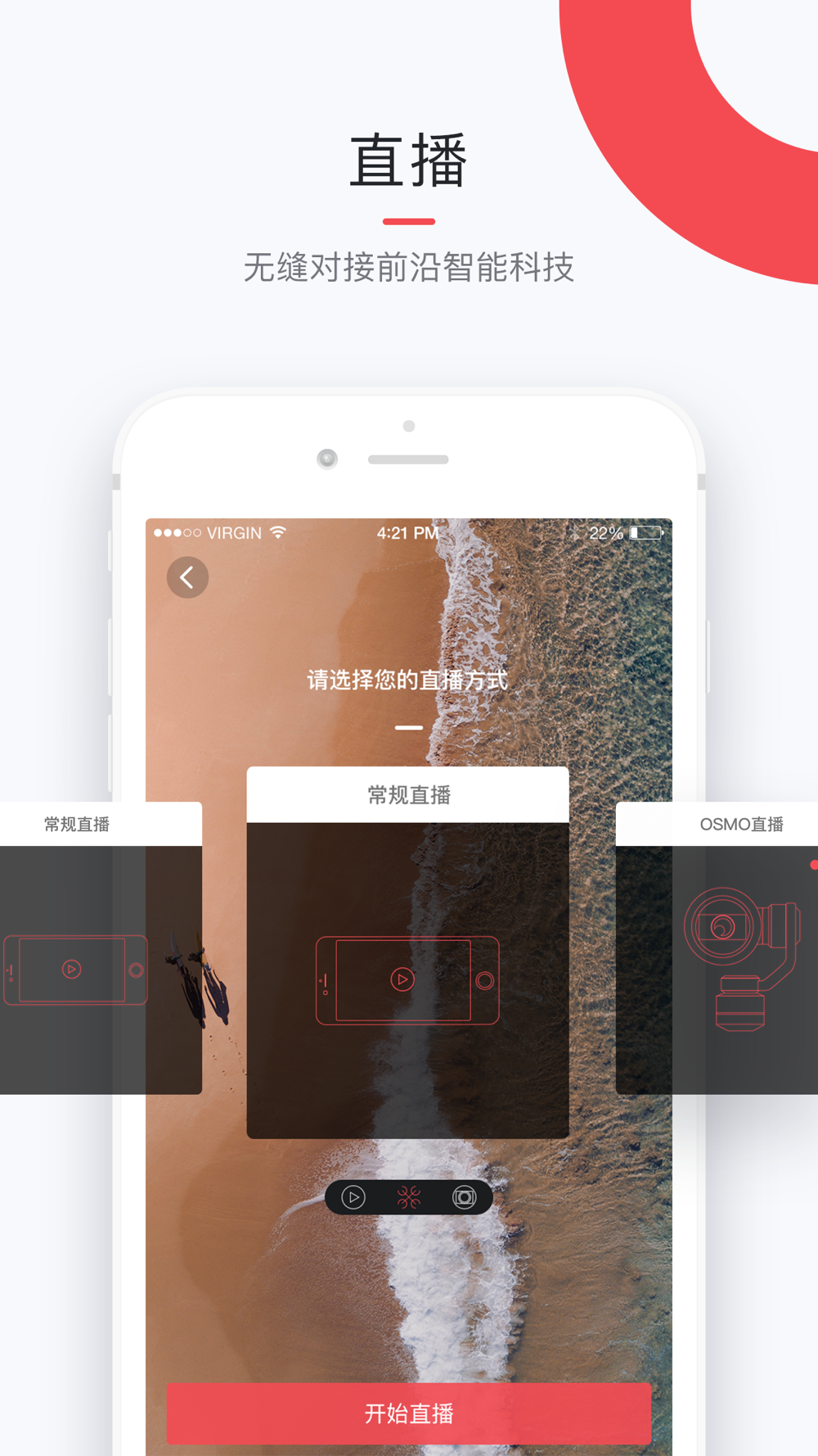 1)直播无缝对接前沿智能科技,支持无人机、OSMO、手机等多方式直播;