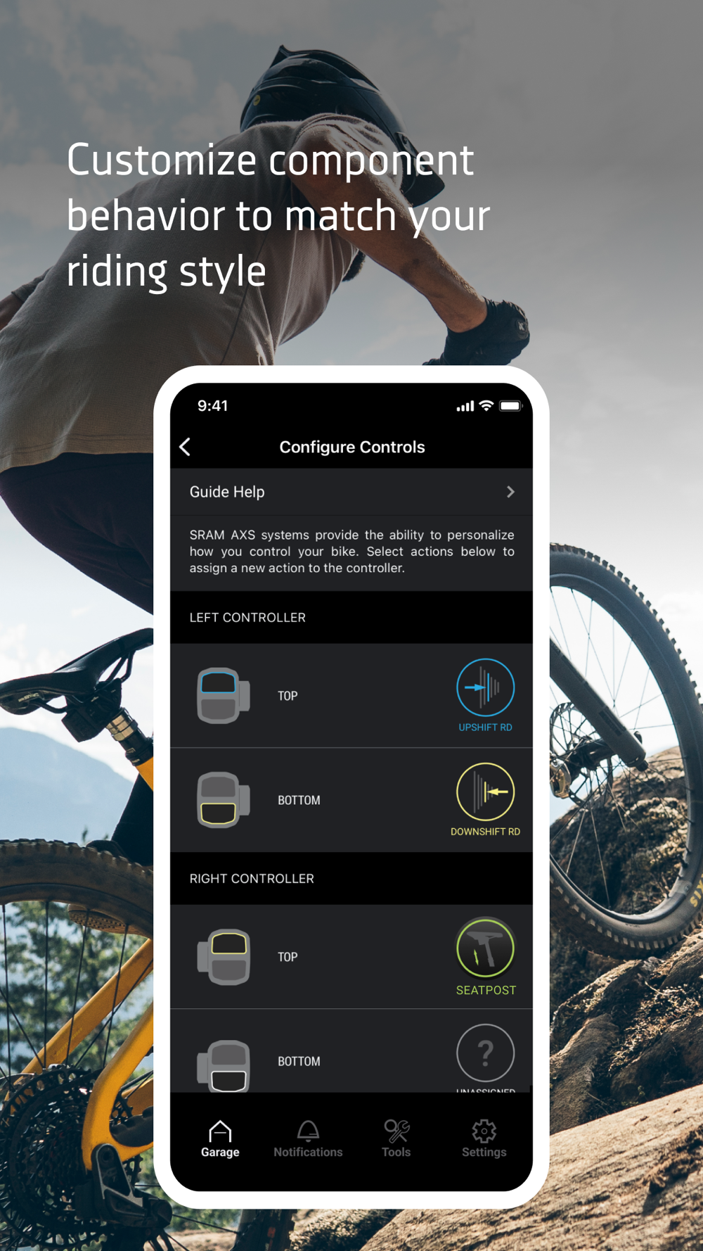 AXS app allows you to control and learn from your bike, bringing new levels of interaction with AXS enabled components. Wake the bike and let it tell you if it is ready to ride based on the battery and pressure levels. The more you know, the more you learn, the more you love.