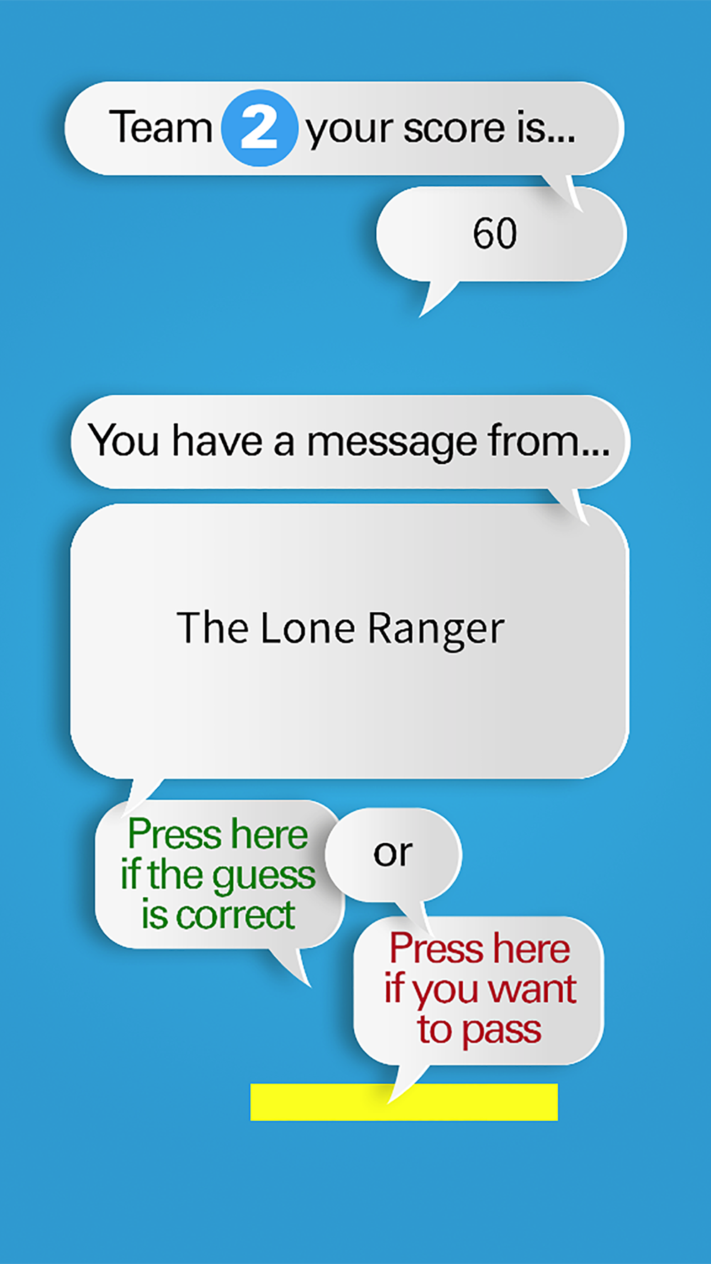 The game of "Celebrities" or "Who's in the Bag" bought up-to-date. You have one minute to get your team members to guess which celebrity, historical or fictional character has appeared in your text message window.