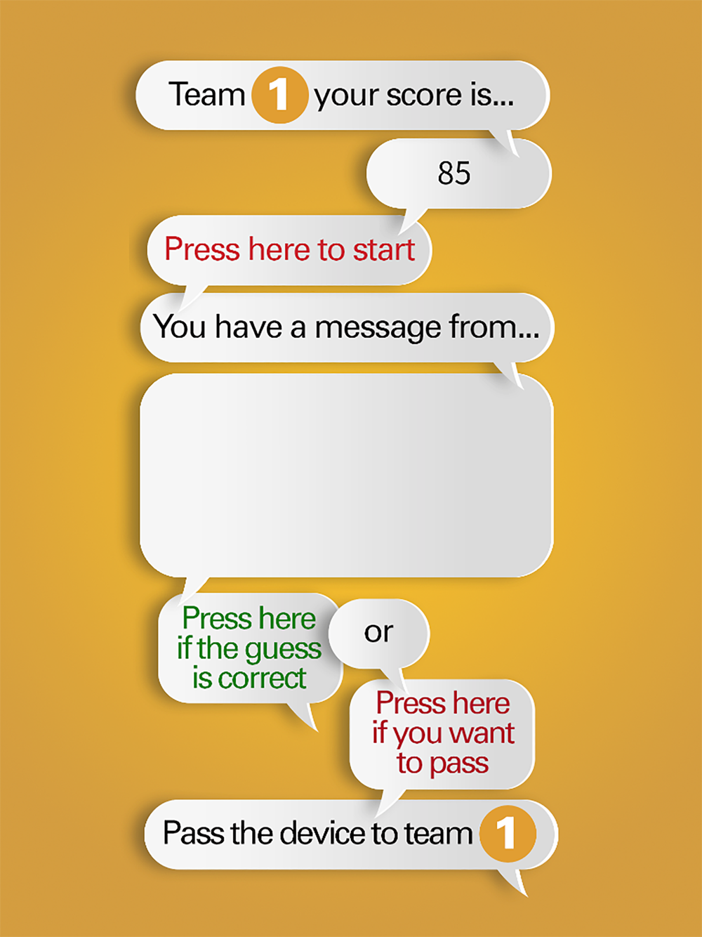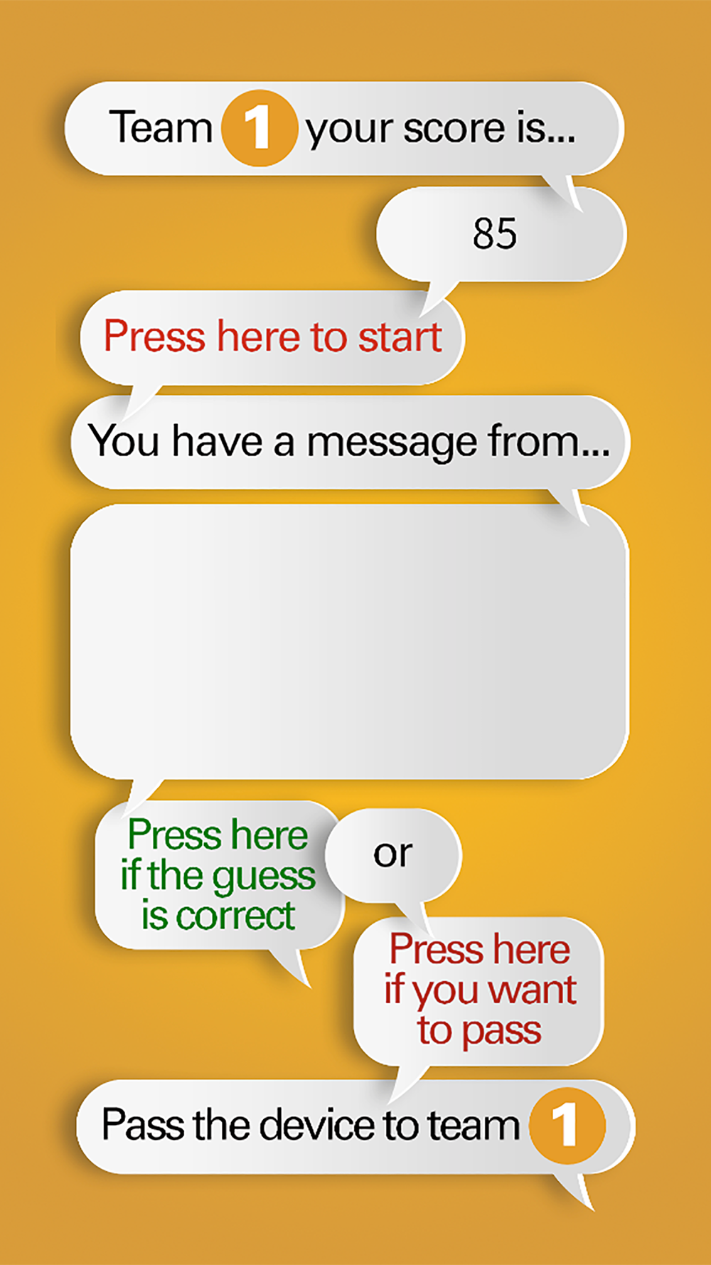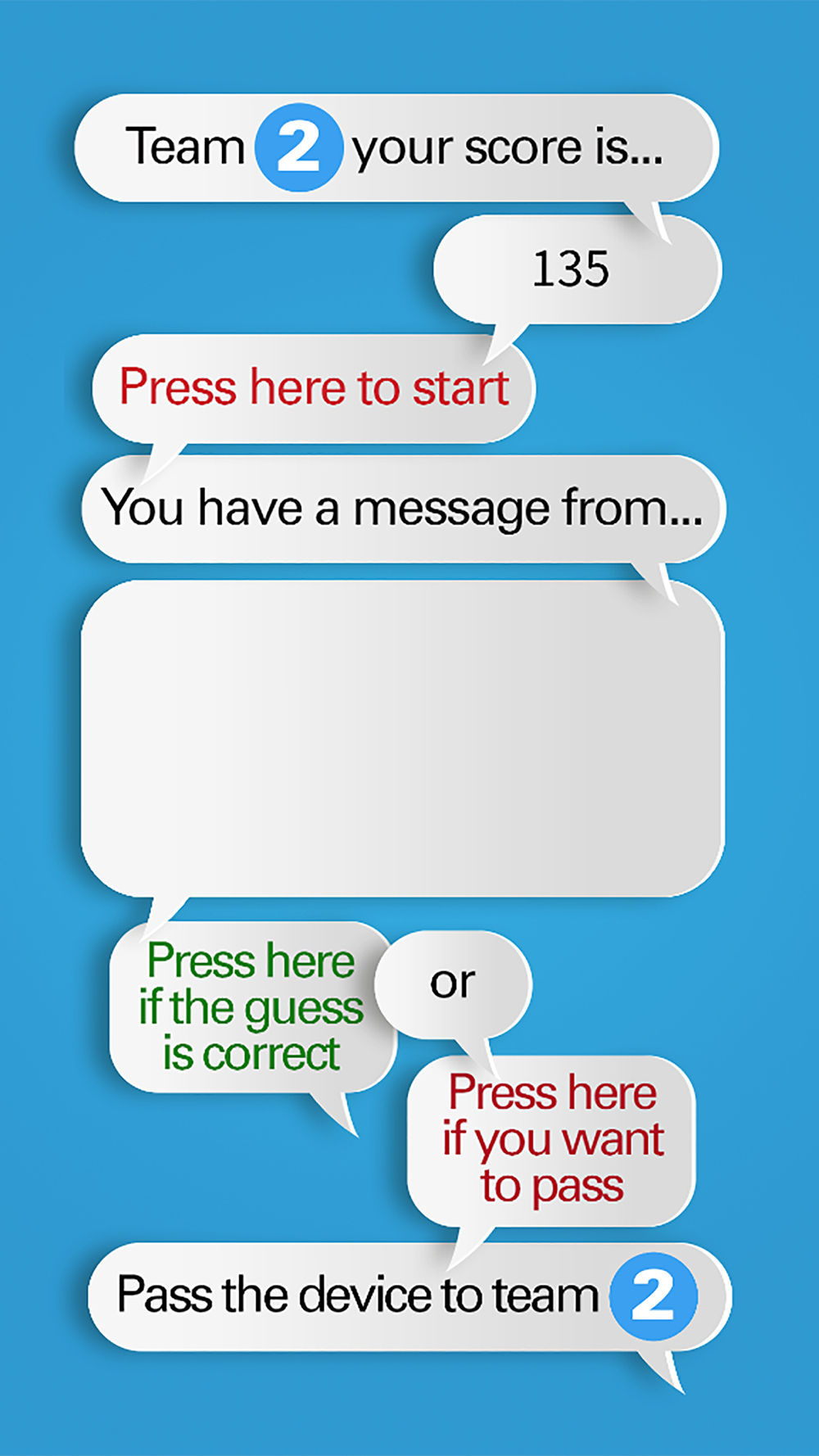 The phone/pad is then passed to the second member of team 1, then the second member of team 2, and so on, until each member of both teams have taken their turn at being the clue giver.