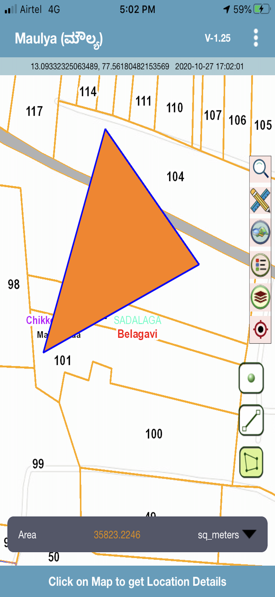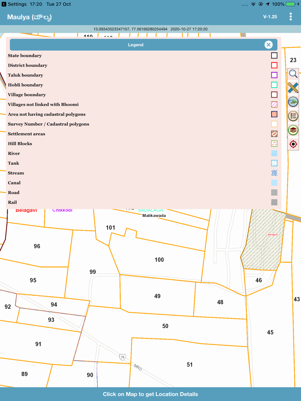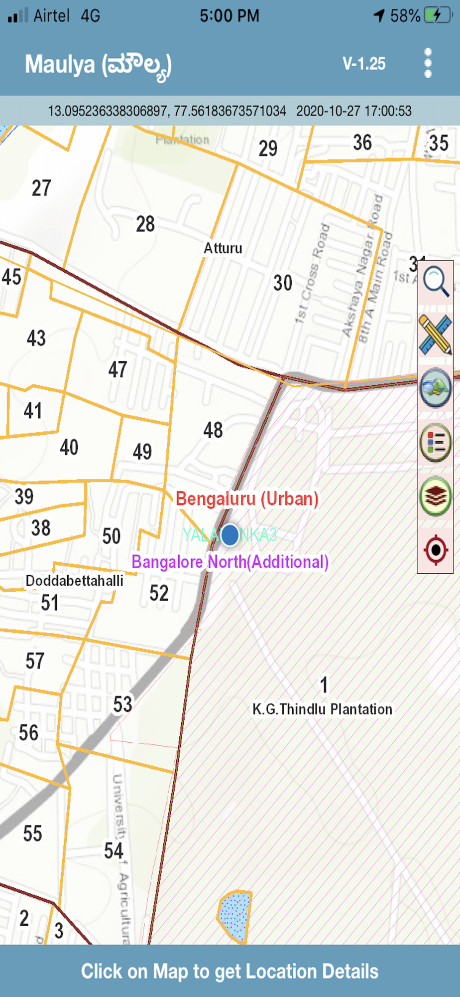 Application will also facilitate to find Survey number and adjacent survey from the users current location and find the Owners details . It provides a link to KAVERI Online service of Department of Stamps & Registration to find the Valuation details of the property.