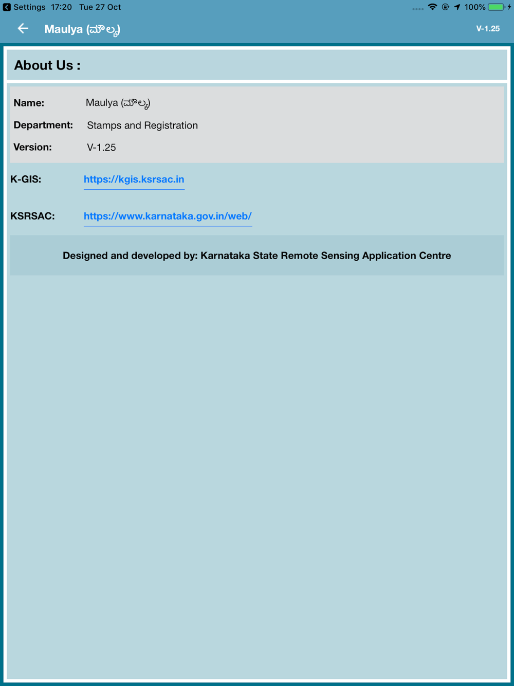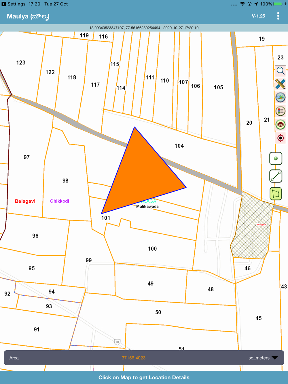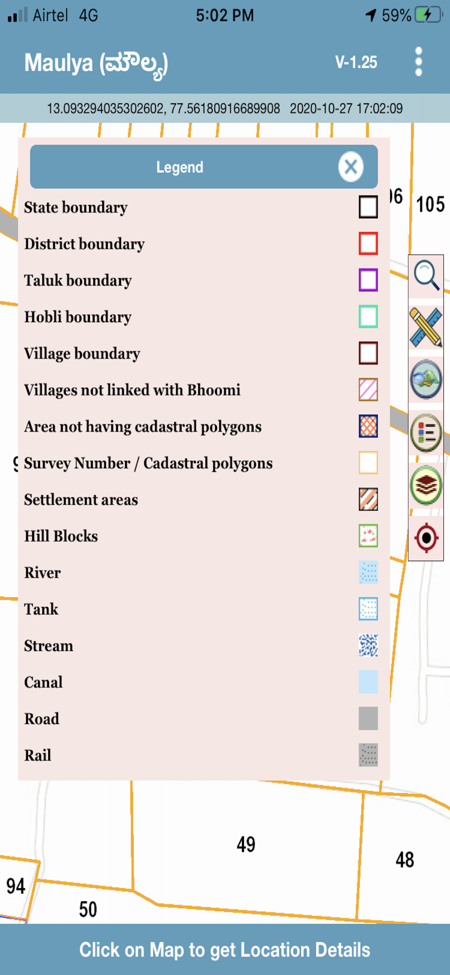 Application will also facilitate to find Survey number and adjacent survey from the users current location and find the Owners details . It provides a link to KAVERI Online service of Department of Stamps & Registration to find the Valuation details of the property.