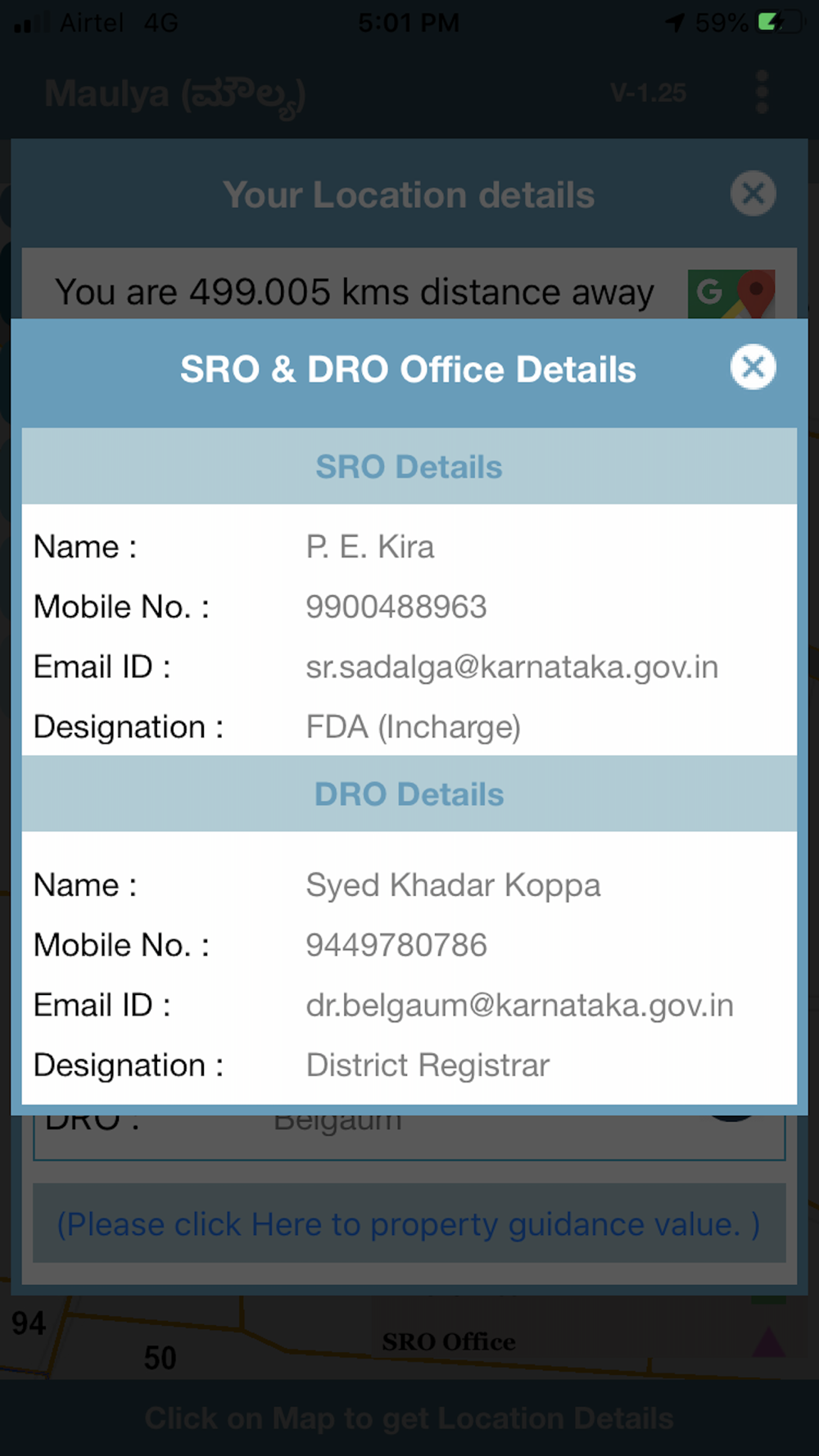 Maulya App will facilitate the user to the find the respective SRO and DRO office location of Department of Stamps & Registration, Government of Karnataka with the details of the person in-charge.