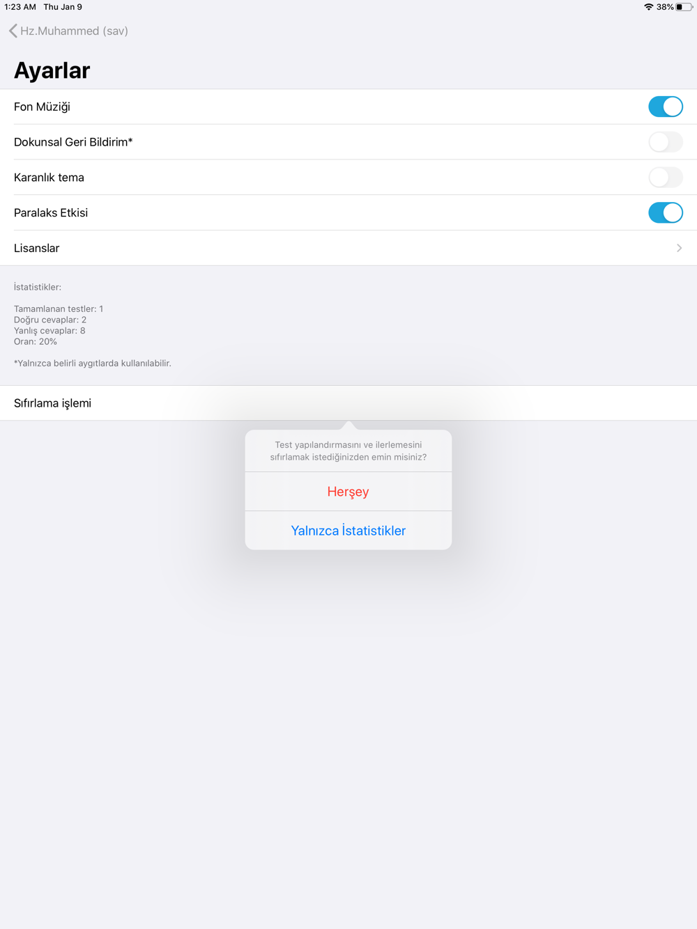 Hz. Muhammed (s.a.v.) i Tanıyalım uygulamasında testlerimiz 4 şıklı 10 soru üzerinden düzenlenmiştir. Toplamda 15 dakika olarak süre sınırlaması vardır, sayaç saniye olarak geri sayım yapmaktadır.