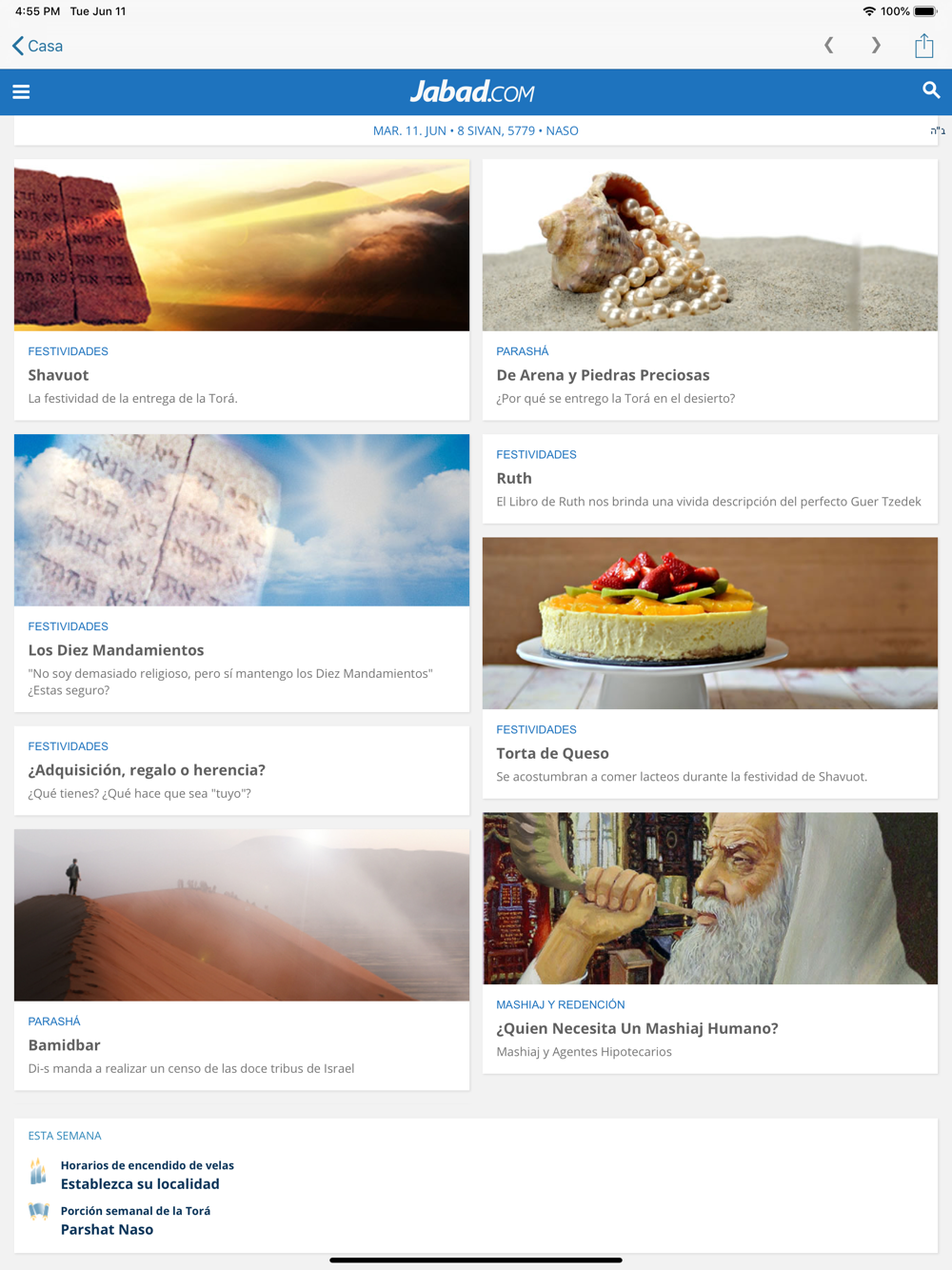 Accede a Chabad.org en español, el sitio web más grande sobre judaísmo. Consulta nuestros artículos sobre diferentes temas, aprende con las clases y vídeos, aprovecha el calendario y las diferentes herramientas para horarios de Shabat y festividades. Todo esto y mucho más.