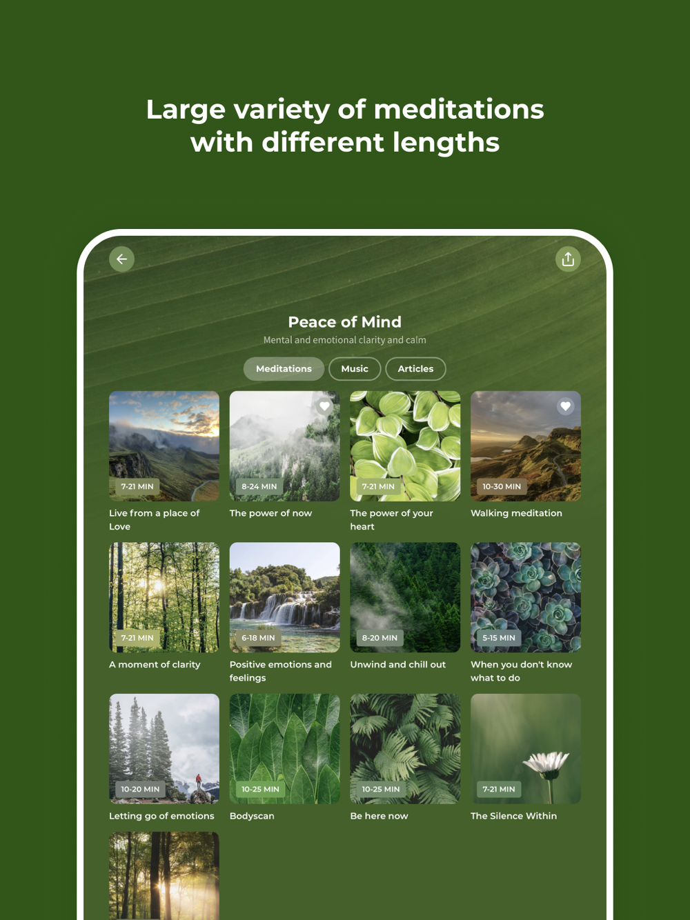 To keep it organized we have divided our meditations into moments: Morning, Evening, Soul Food, Kids, Peace of Mind, Affirmations, Inner Wisdom.