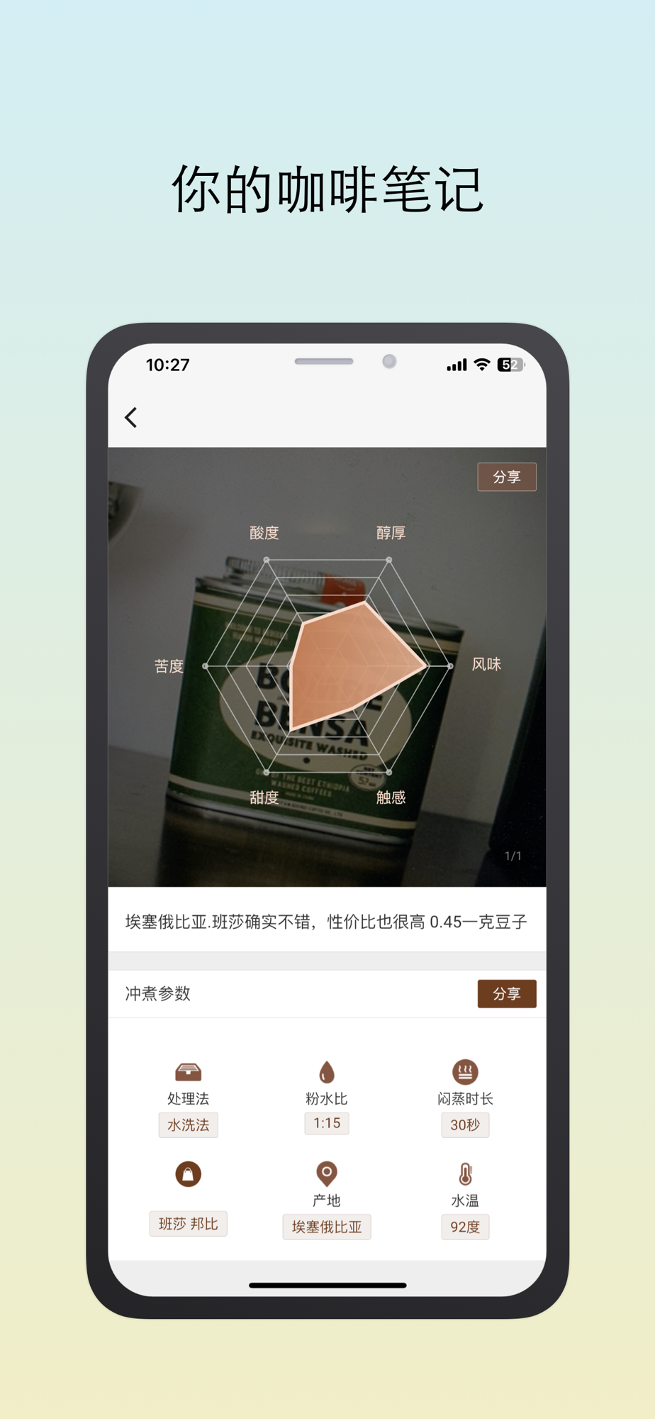 您每发布一次咖啡笔记,我们都会帮你统计出你喝了多少次咖啡、多少种咖啡豆、多少克、一共冲煮了多长时间、每种咖啡豆冲了多少次等等。